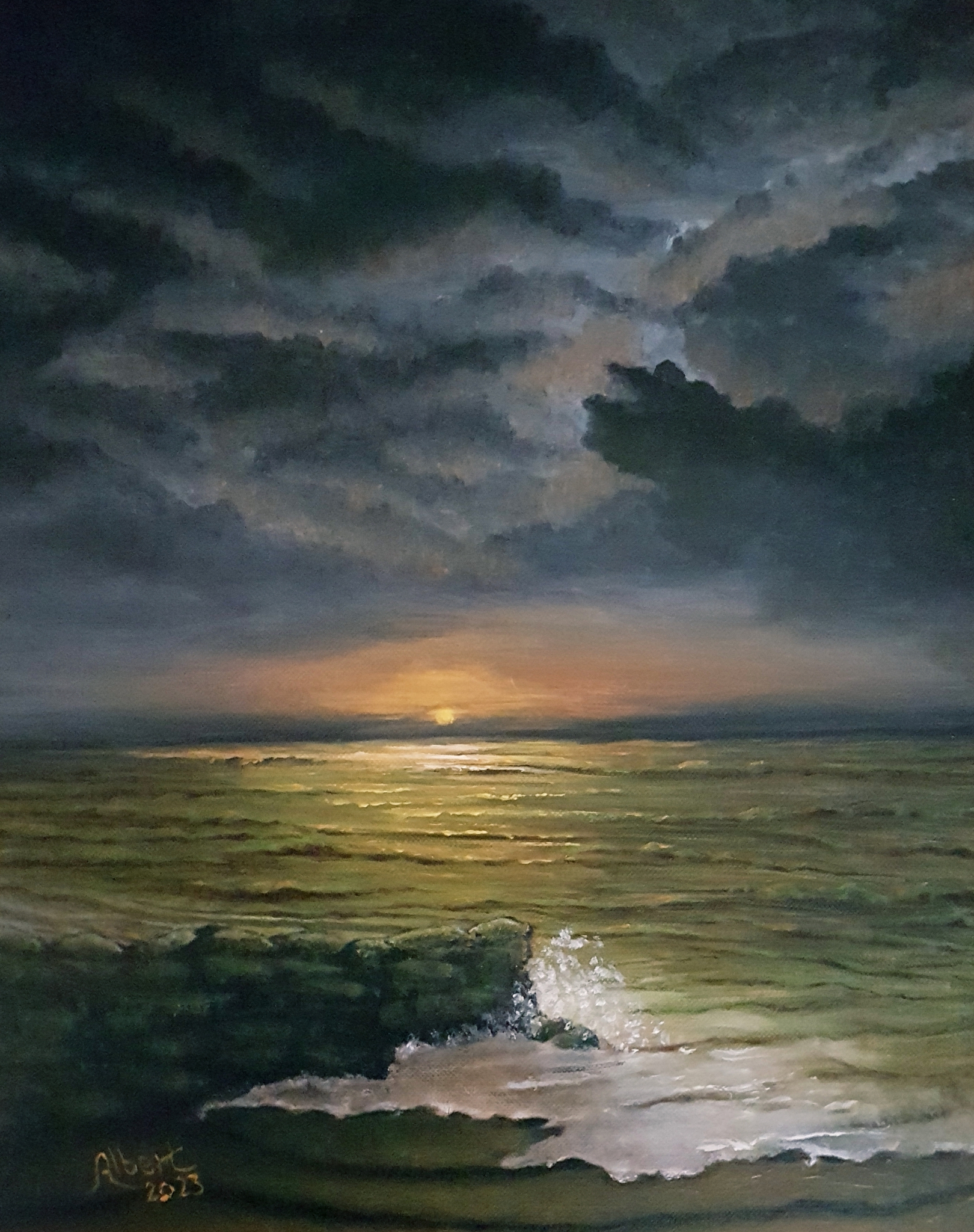 Landschap Zeegezicht Donker Wolkenlucht Zonsondergang Olieverf