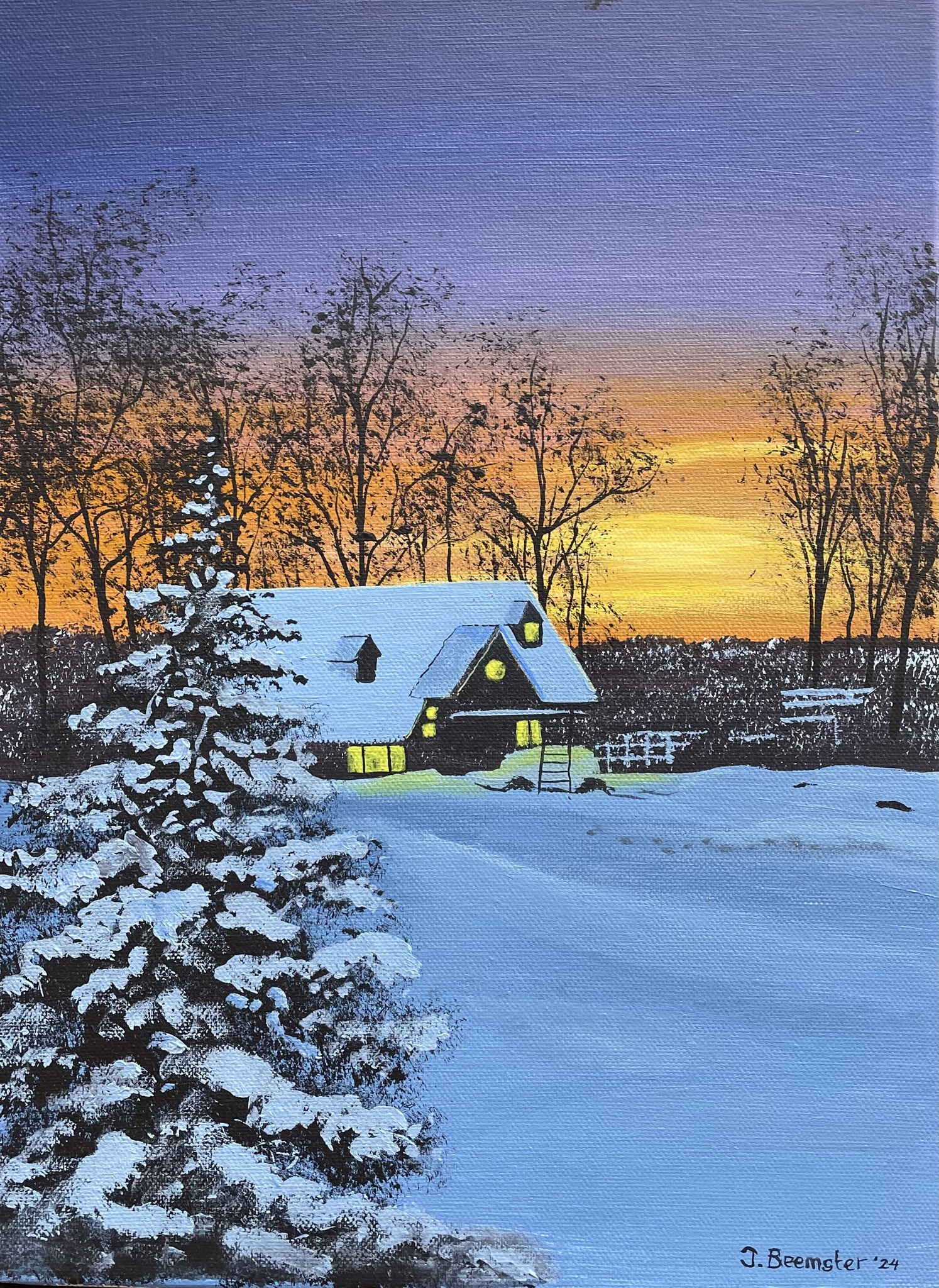 Ieder jaar mag ik een schilderij maken voor het bedrijf waar ik werk. Er wordt nog tekst op de foto, die van het schilderij gemaakt is, toegevoegd. Deze wordt dan gebruikt als digitale kerstkaart en wordt verstuurd naar de collega's en wordt op LinkedIn geplaatst.
