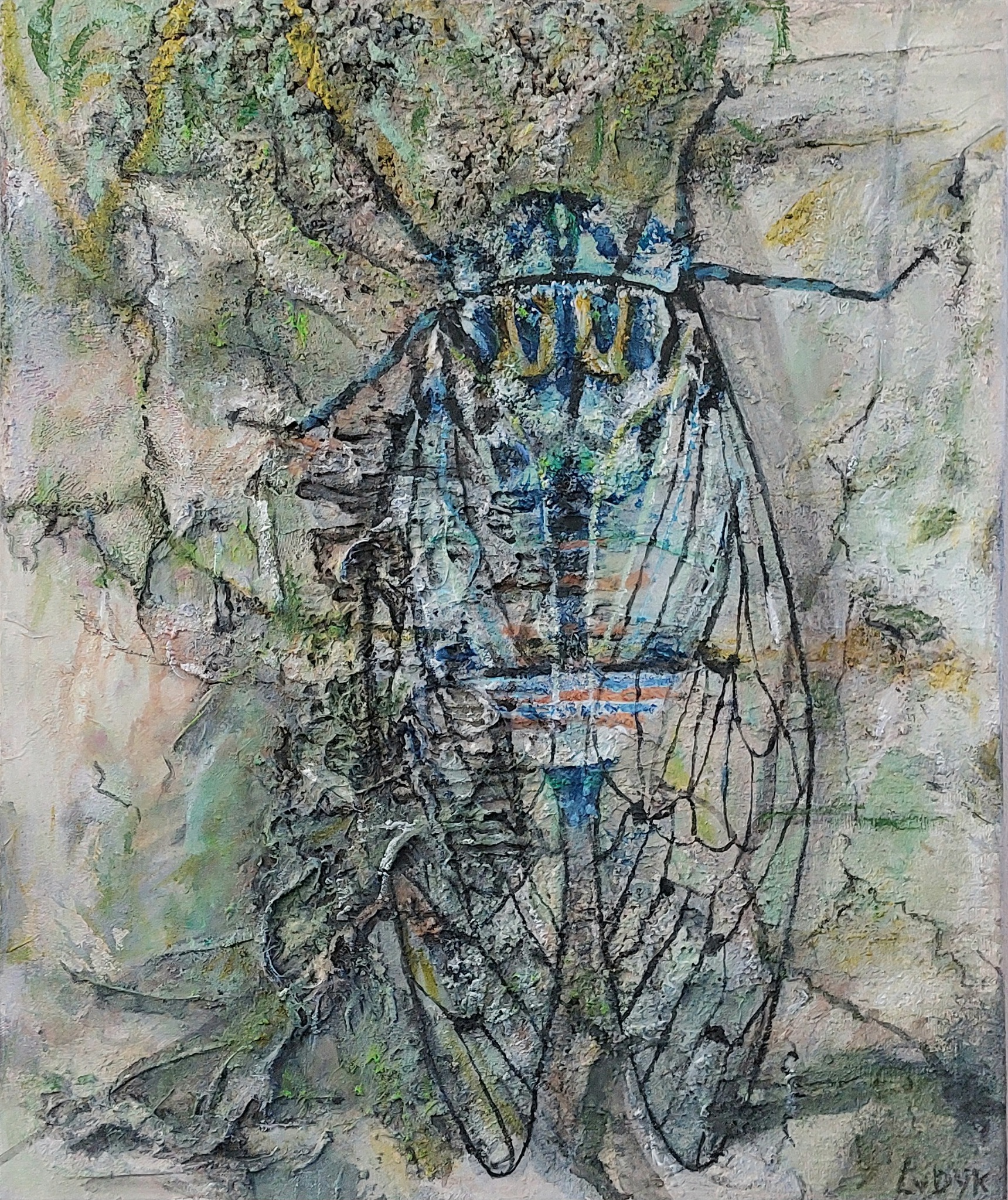 Iets in de buitenwereld intrigeert mij en door deze impressie uit te werken wordt zij blijvend deel van mijn binnenwereld. Laag na laag bouw ik aan de uiteindelijke vorm. Tijdens het werken komt er een stroom van associaties op gang. Het is een constant zoeken naar evenwicht tussen de verf en de andere materialen.