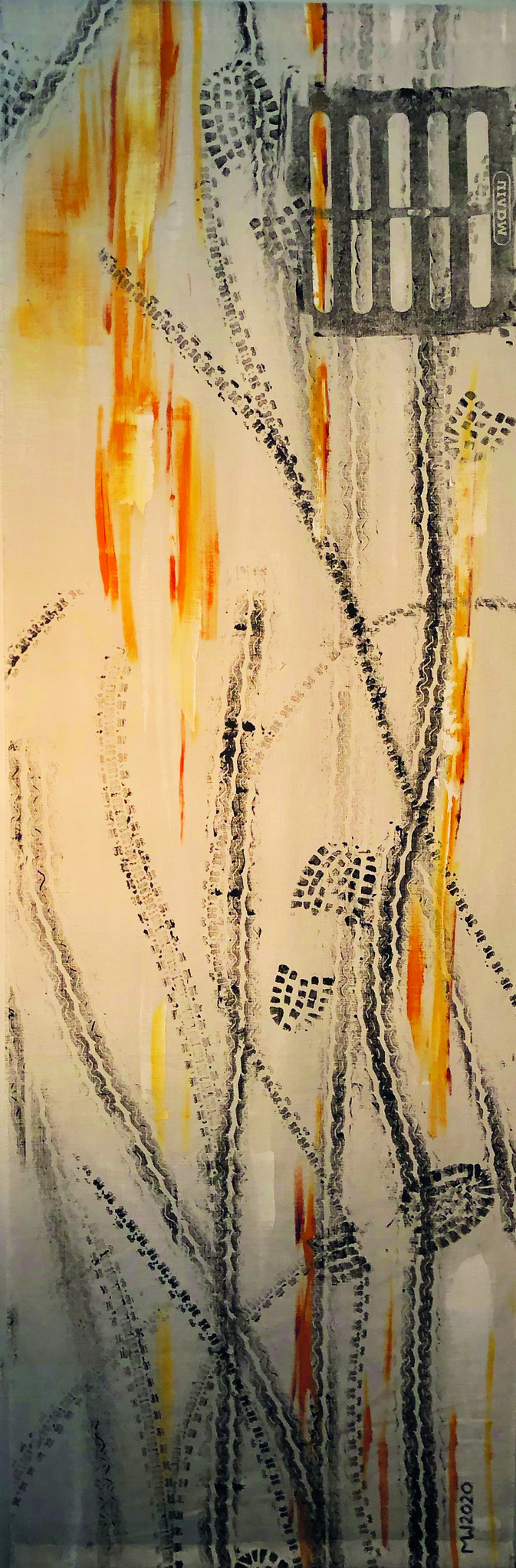 geschilderd met acryl op los linnen doek word d.m.v. een zoom aan de boven en onderkant opgehangen