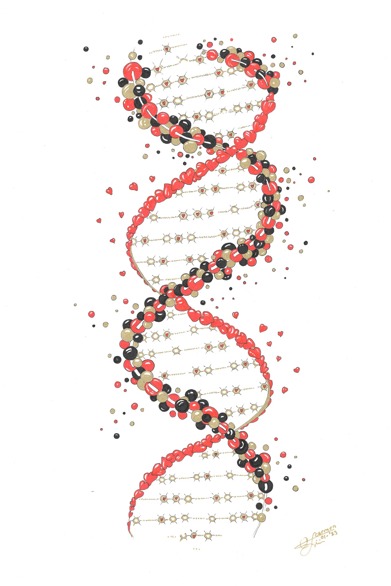 LOVE IS IN OUR D-N-A deze tekening is door mij gemaakt en vond de inspiratie tijdens de COVID. Hoe is het mogelijk dat onze eigenschappen worden veranderd door inmenging van menselijk geweld. De pijn die ik als kunstenaar voelde ging letterlijk door mijn ziel. Deze pentekening is gemaakt in rood/zwart en goud en zijn de traditionele kleuren van Roemenië. Door deze inspiratie ontstond er een schouwspel van kleuren en vormen die als geheel bijelkaar passen. Deze pentekening is verkocht en word als copy verkocht de prijs is op aanvraag.