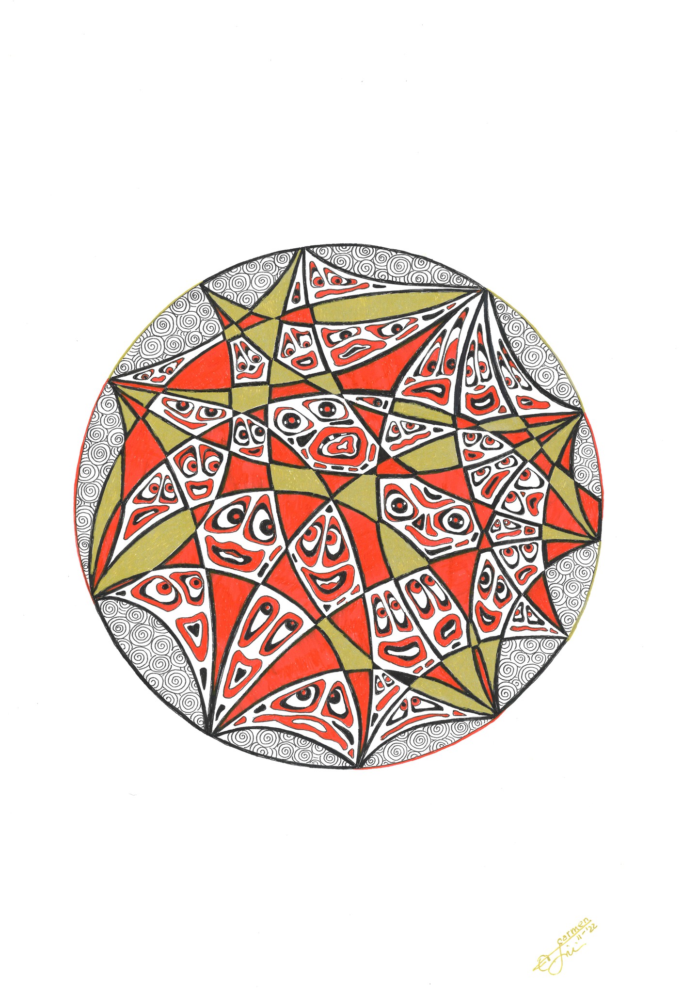 #pentekening #rood #zwart #carmentodita #rond #goud #youneverknow #cirkelofliven
