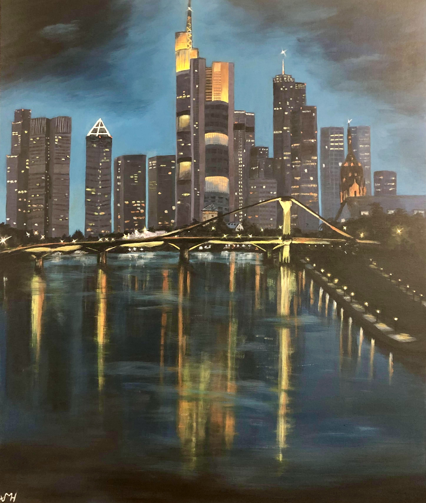 Dit schilderij toont de indrukwekkende skyline van Frankfurt bij nacht, waarin de iconische moderne architectuur prachtig wordt weerspiegeld in de rivier de Main. De warme gloed van de verlichte gebouwen en de sfeervolle verlichting van de brug creëren een harmonieus contrast met de diepe blauwe tinten van de nacht. Een betoverende weergave van Frankfurt als stad van moderniteit en elegantie.