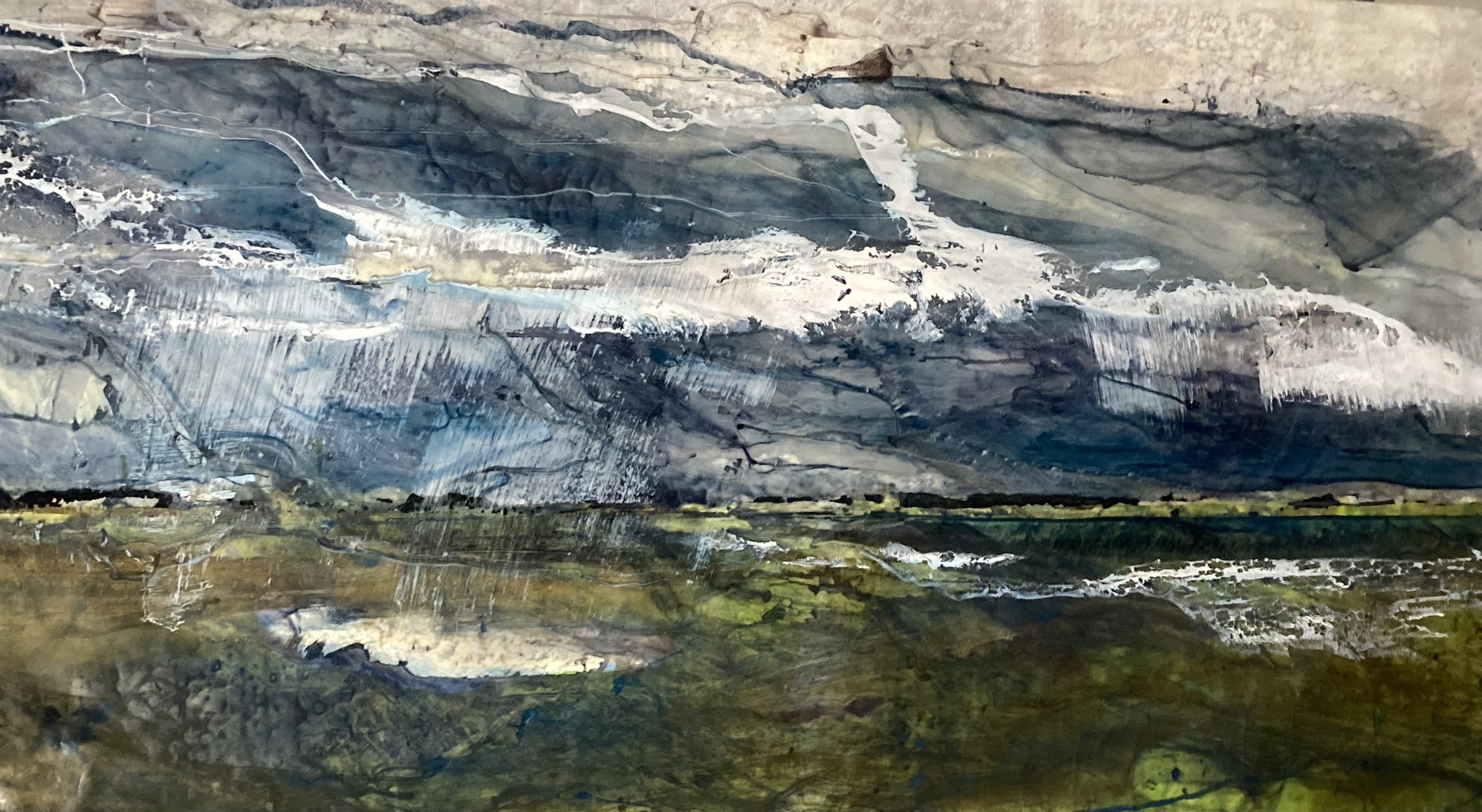 Impressie van een wadden landschap. Lucht en land lopen in elkaar over.