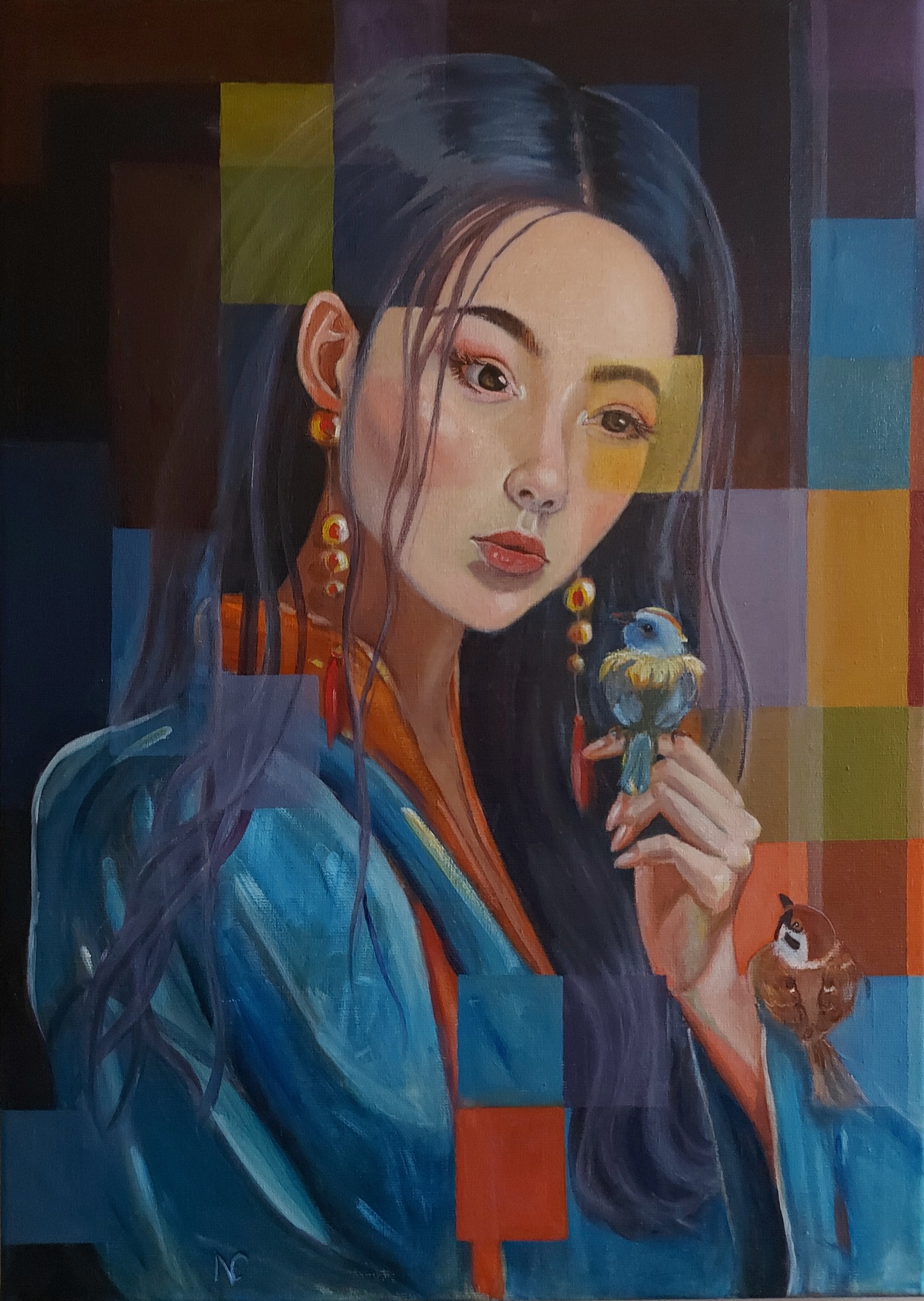Meisje Vogel Olieverf Oosters
