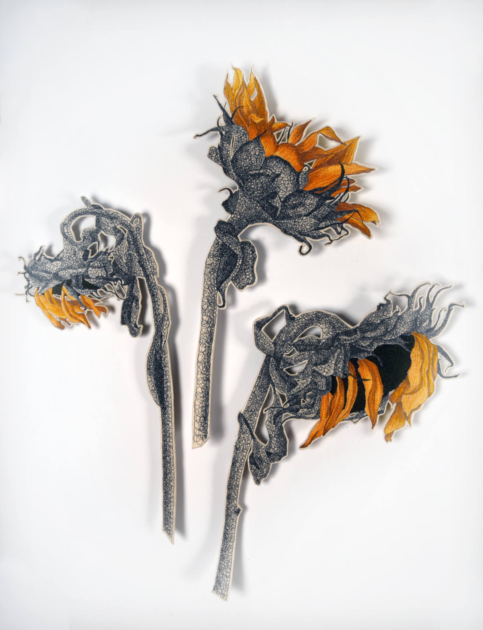 De zonnebloem staat symbool voor Oekraine. Al drie jaar lang wordt het land geteisterd door oorlog. Mensen komen om, gebouwen en lkand wordt verwoest. De zonnebloemen verwelken. Hopelijk komt er snel een einde aan deze ellende en kan het land opgebouwd worden, kunnen de zonnebloemen ontuiken en tot volle wasdom komen. Het totale werk is een drieluik.