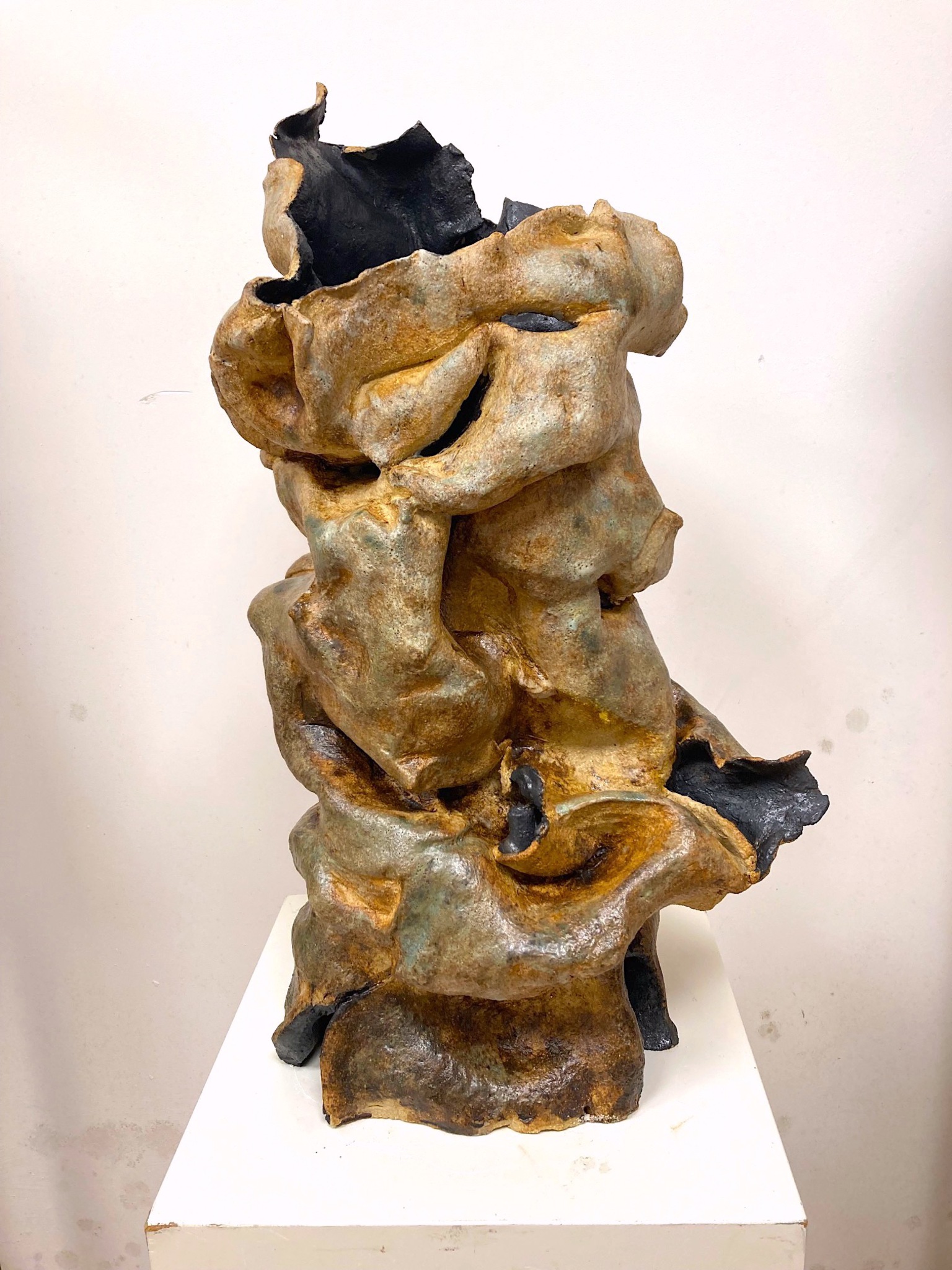 Aarde. Abstract beeld van klei dat de aarde in diverse vormen laat zien: van een woestijn naar een rotsig landschap met diepe spleten naar het groen van een bos. De serie 'Elementen' is geinspireerd op klimaatverandering en wat voor invloed dat heeft op de elementen (Aarde, Water, Lucht en Vuur). Glazuren: diverse oxydes en dolomiet mat. Kleuren: wit/creme, geel, bruin, groen en zwart. Het beeld kan zowel binnen als buiten staan (het is winterhard). Eventueel kan het beeld op een sokkel worden gemonteerd.
