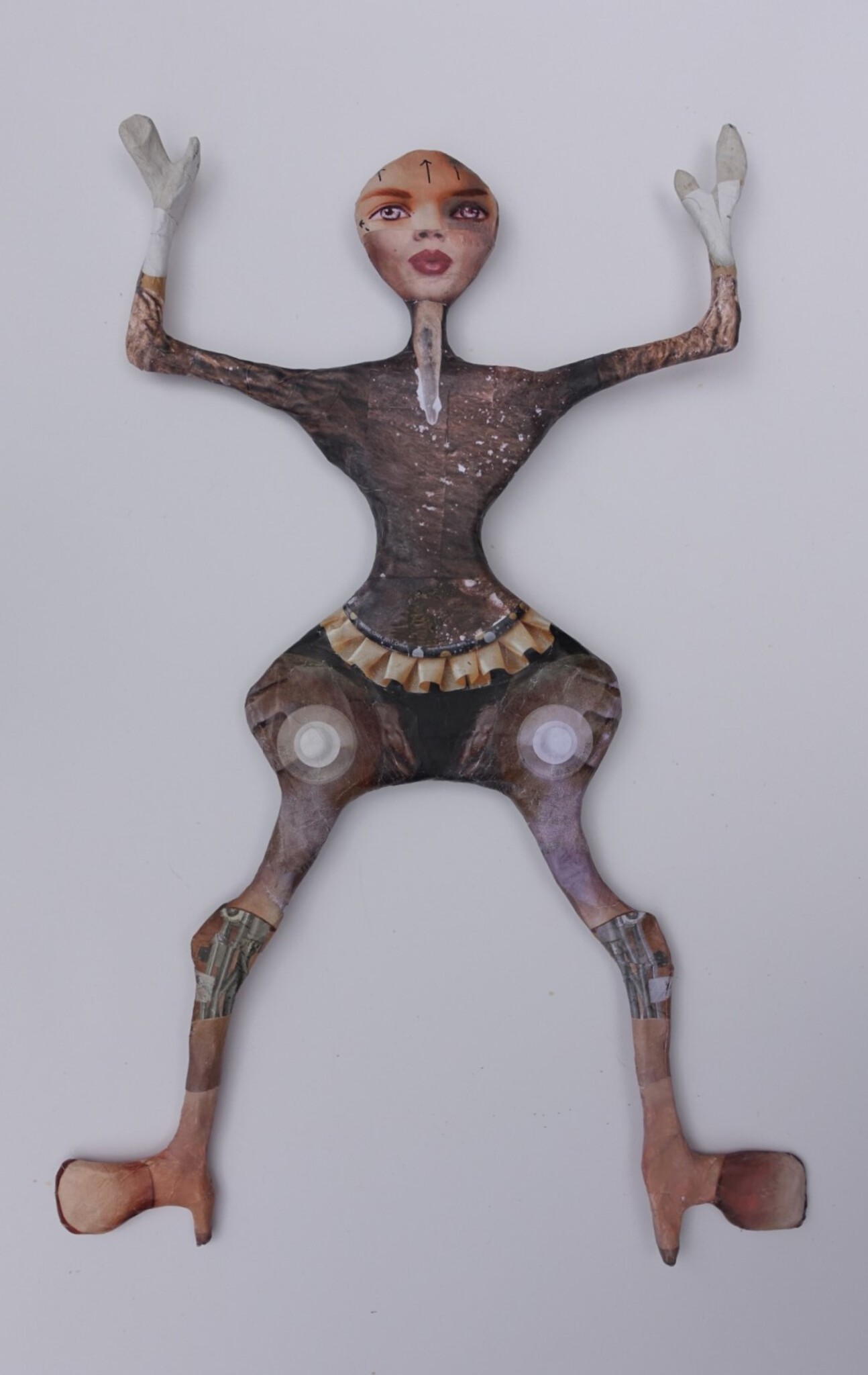 Platte pop gemaakt in papier maché en beplakt met collagemateriaal dat daarna bijgeschilderd is.