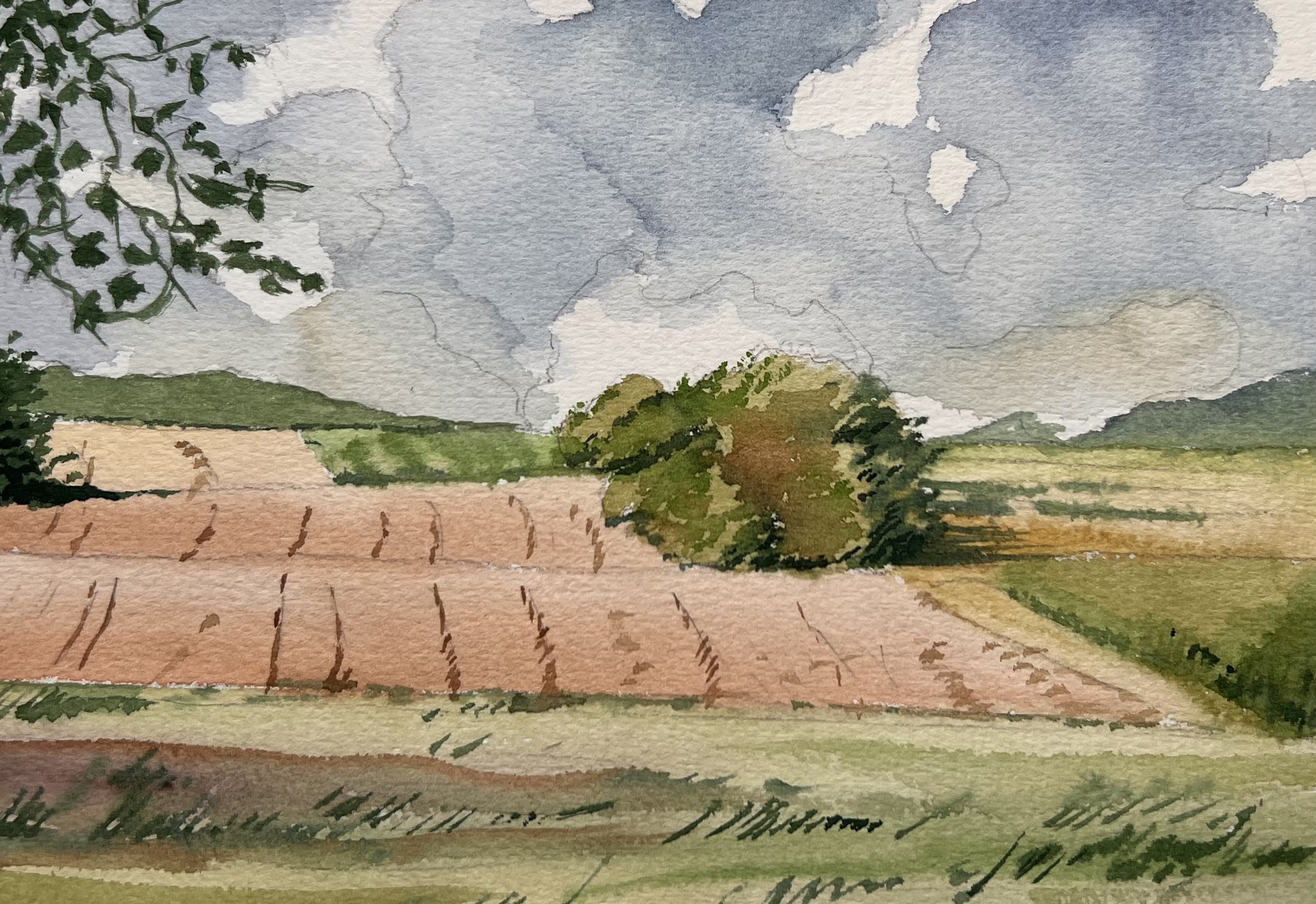 Bij een fietstocht richting Heuvelland zag ik dit landschap dat ik meteen in enkele vlugge pennetrekken wist te vereeuwigen. Later werkte ik het uit in mijn atelier.