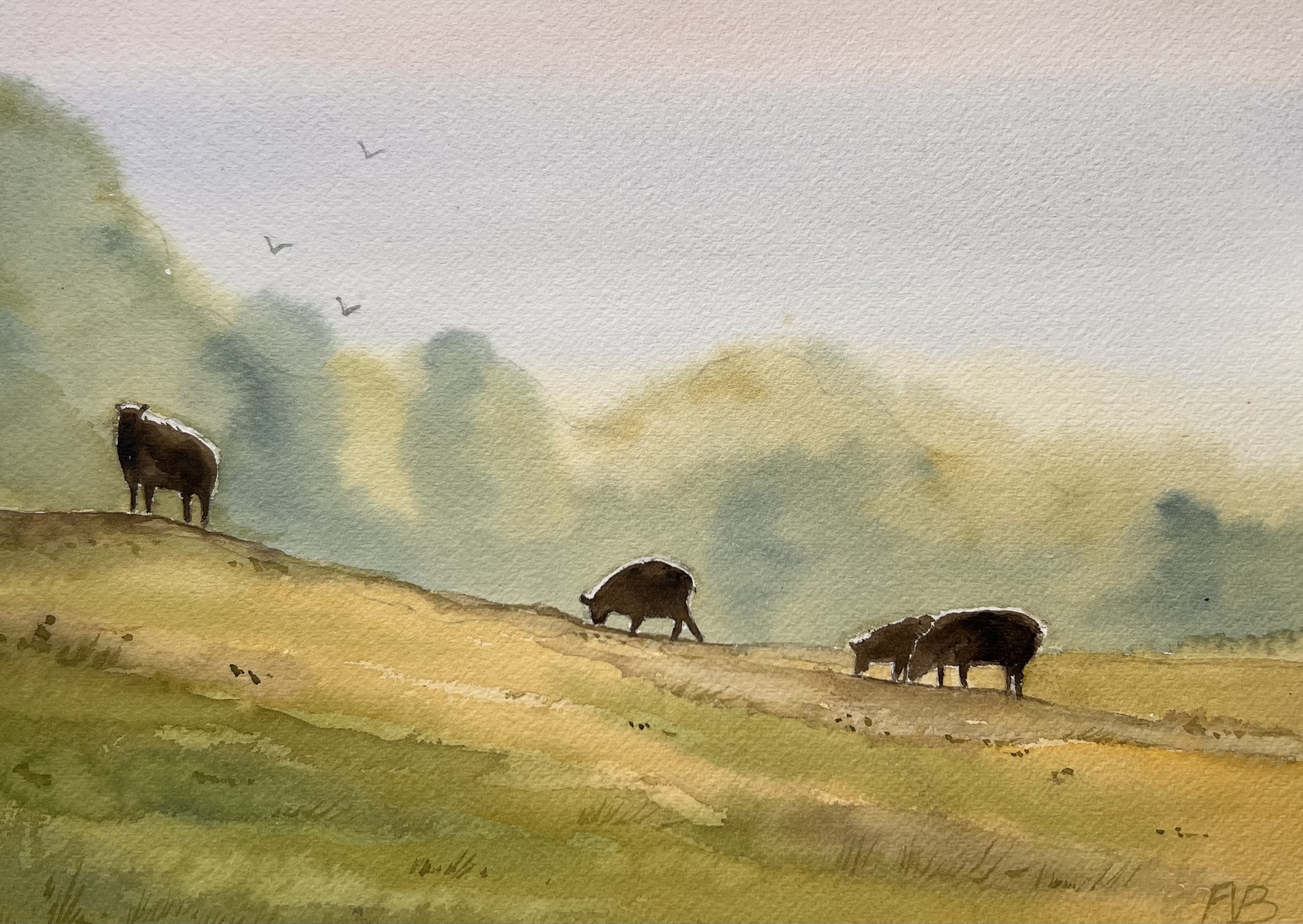 Het lichtspel van grazende schapen tegenover een nevelachtig landschap inspireerden mij tot deze aquarel.