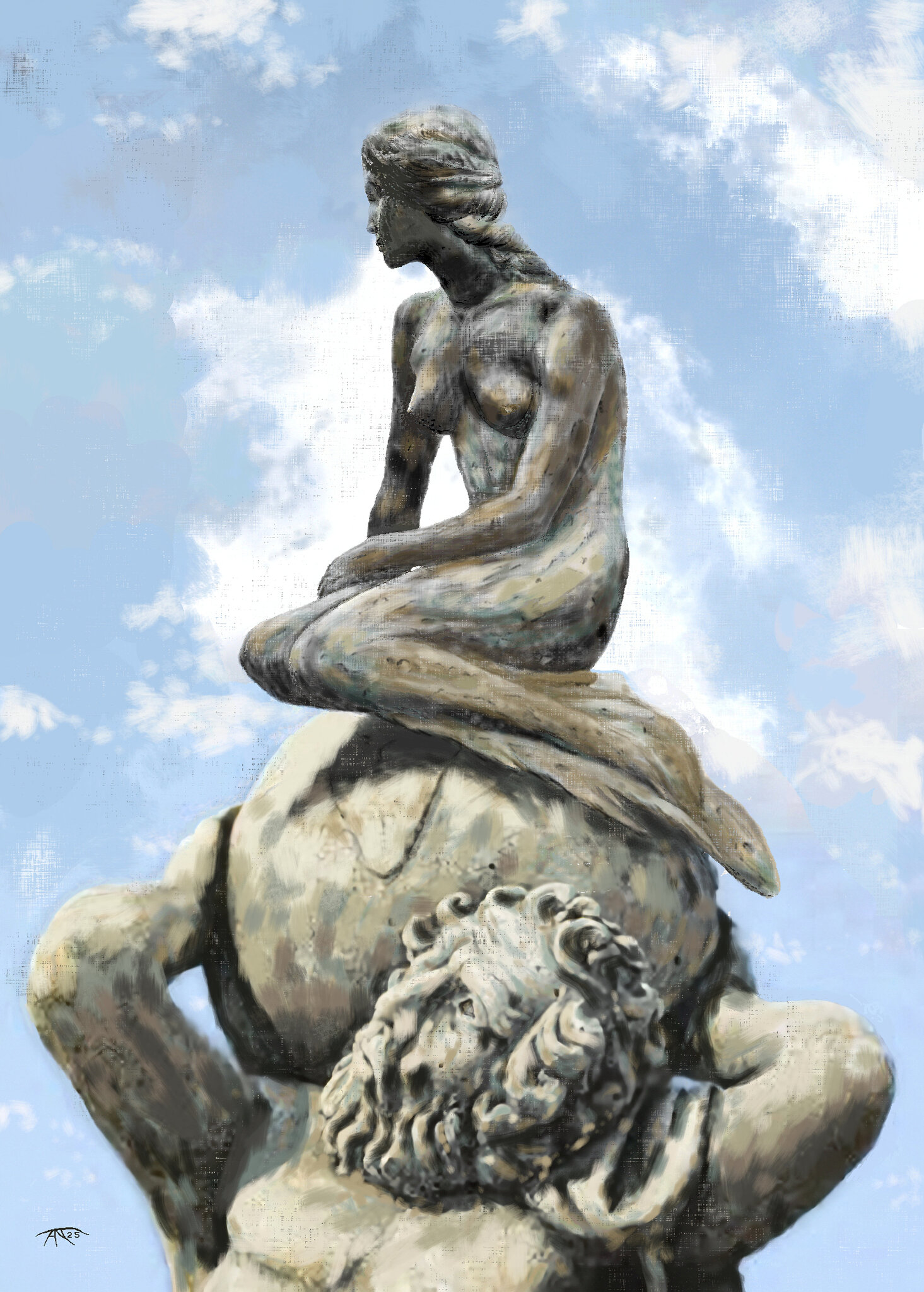 Na aanschaf van een eenvoudige tekentablet besloot ik als oefening een brush schilderij te maken van het prachtige beeld van de kleine zeemeermin die ik in Kopenhagen had gefotografeerd. Het brushen met zo'n pen is zoveel makkelijker dan het werken met een muis. Het lijkt op het werken met je penseel. In plaats van de rots liet ik de meermin op het hemelgewelf zitten, die Altas op zijn schouders draagt. Het idee is dat de meermin in het sprookje van H.C Andersen verlangend op de rots wacht op het ochtendrood, die haar dood zou betekenen. In het schilderij is de meermin uit het water en is in één geworden met de rots van het hemelgewelf.