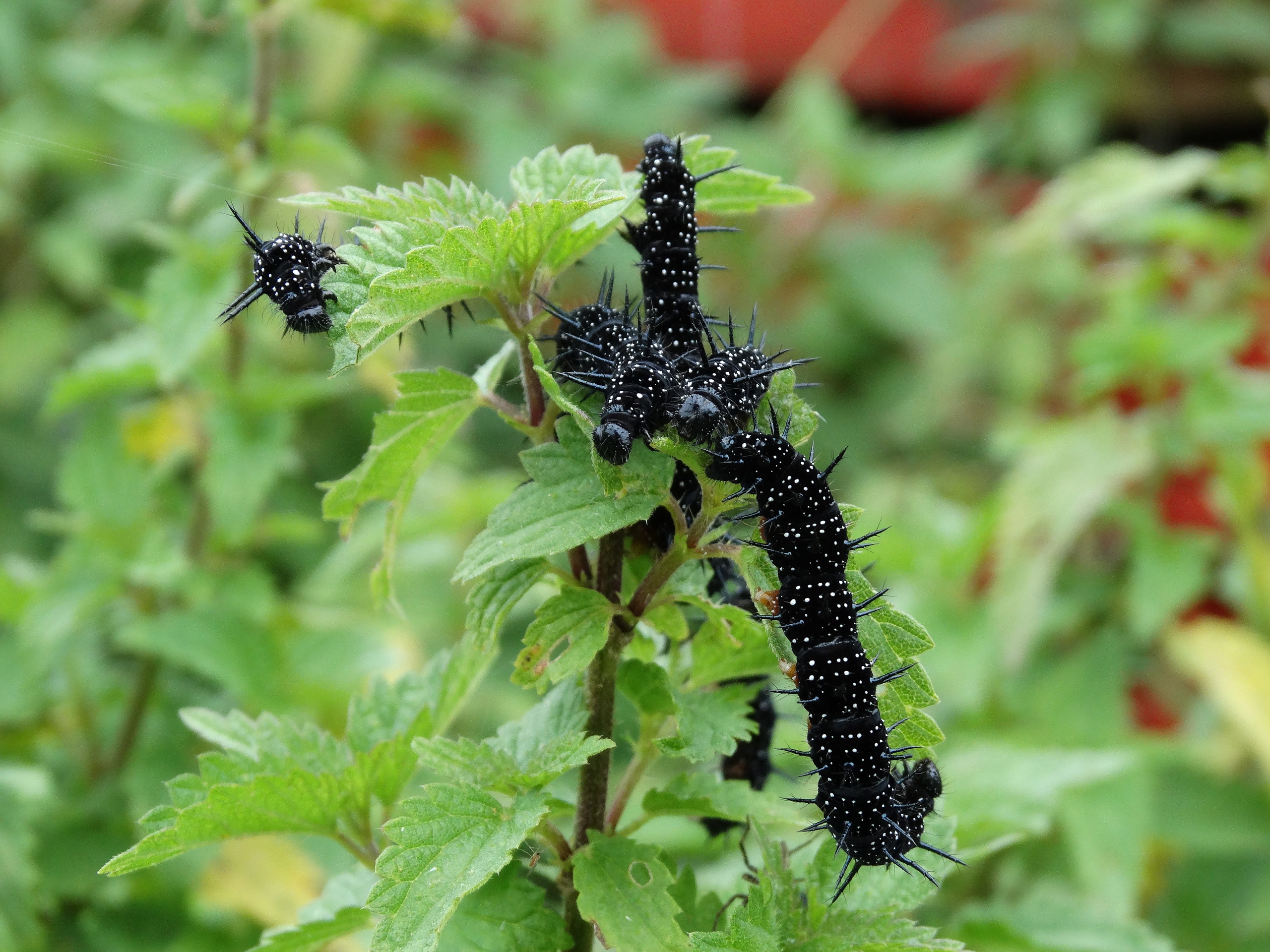 larven van Dagpauwoog (Aglais io) op brandnetel (urtica dioica)