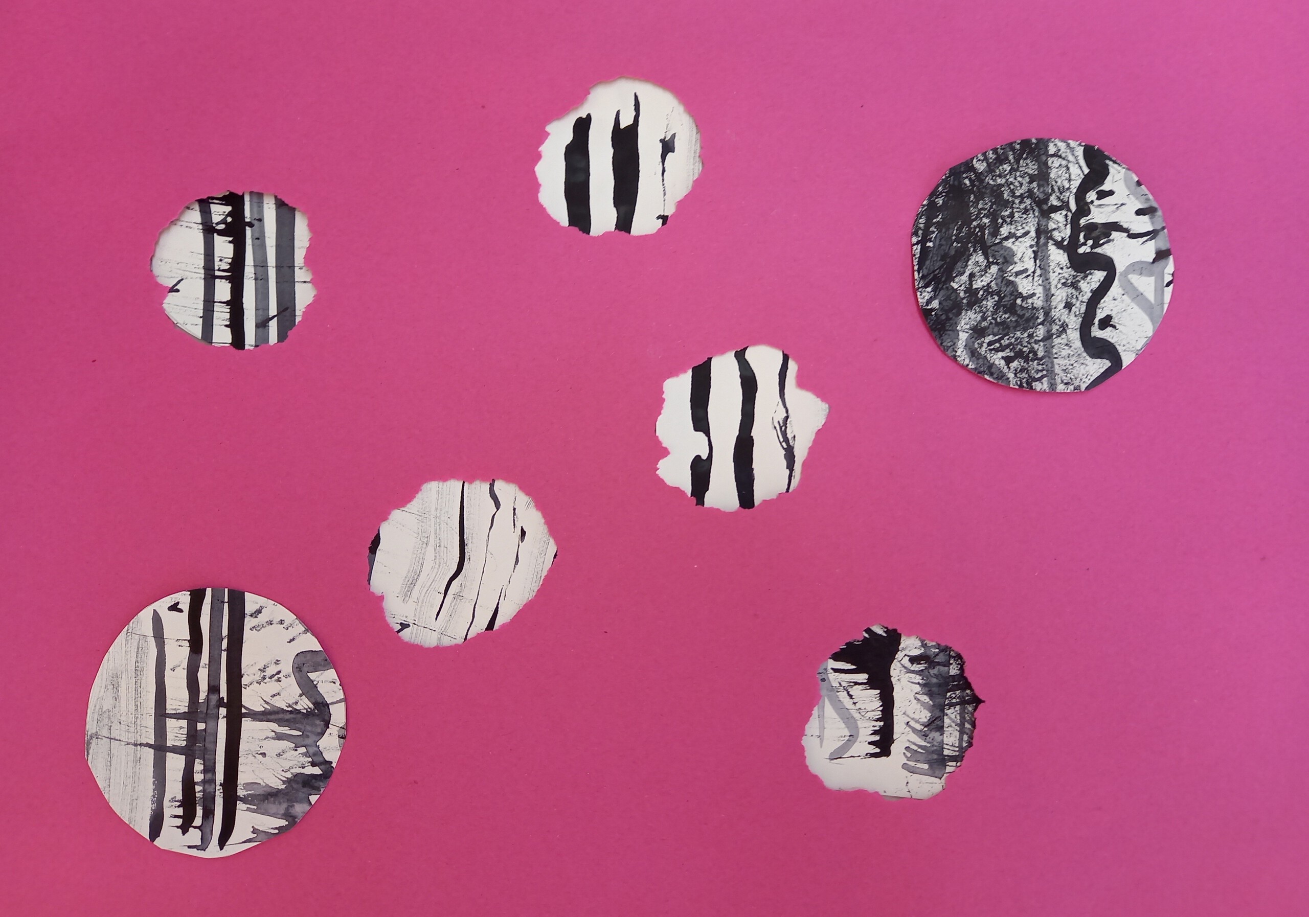 Abstract expressionistische schilderijen: geen herkenning van onderwerpen wel harmonisch in elkaar vloeiende vormen en doorwerkte kleuren. Als tegenhanger hiervan zijn de werken op papier zwart wit.