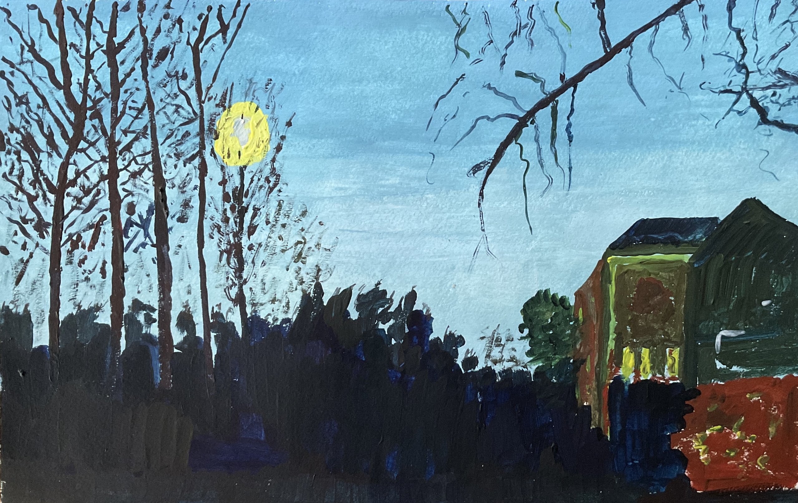 Wit Geel Blauw Bruin Maan Bomen Winter Takken Hemel Huizen Roodbruin Struiken Avondlicht