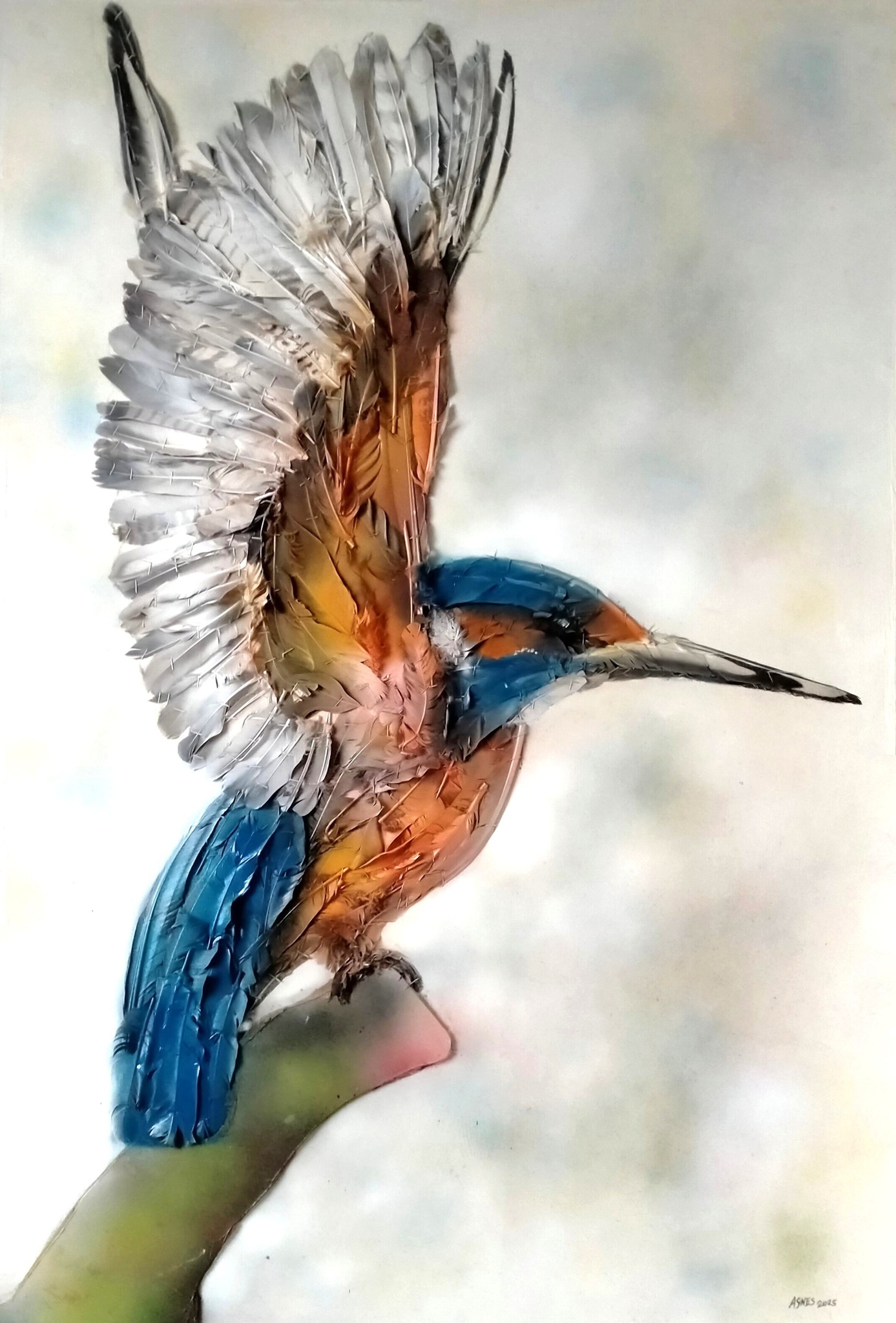IJsvogel 2, dit keer met open vleugels Materiaal: vogelveren, spuitverf, op mdf