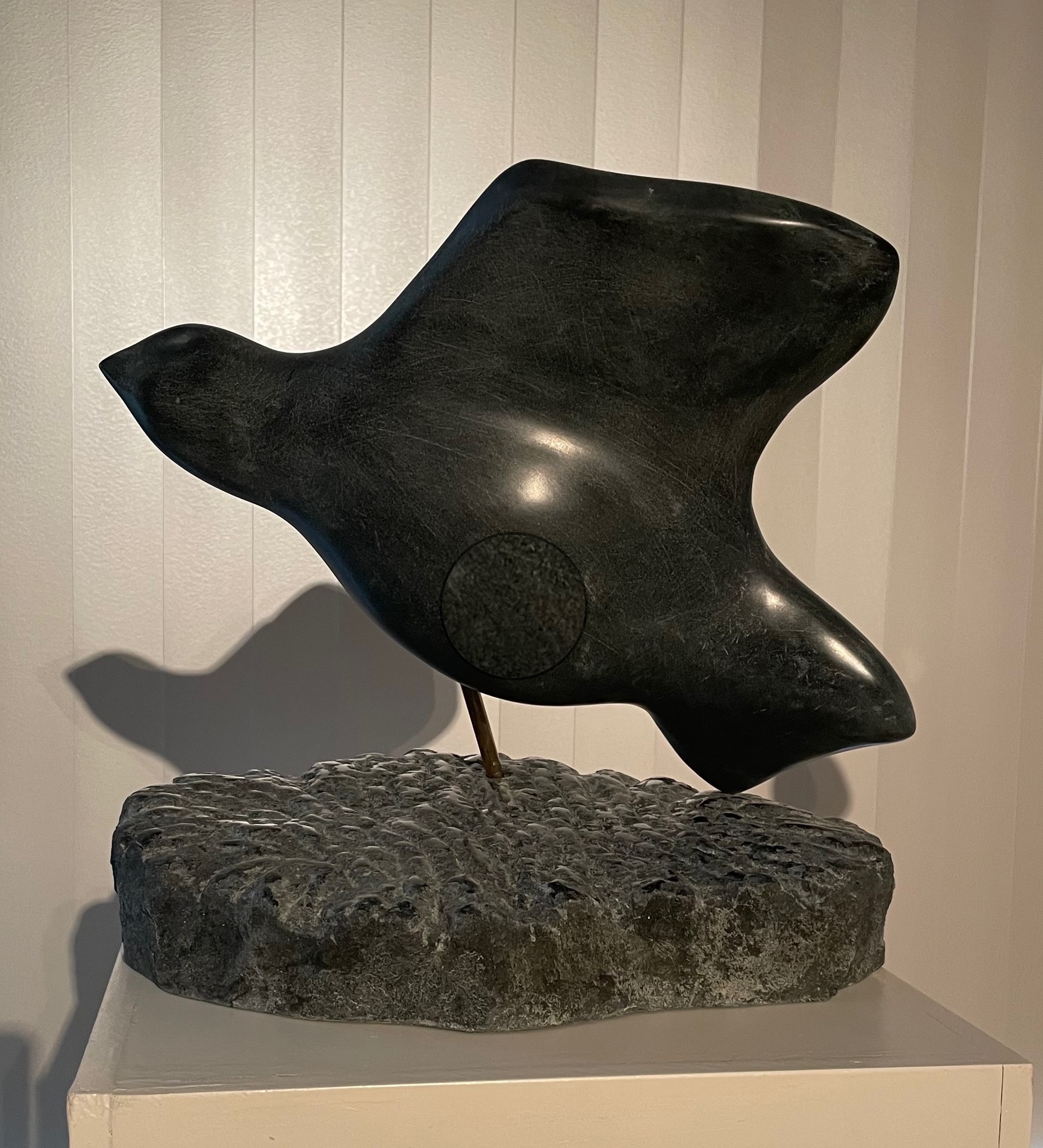 (197) vogel van zwart speksteen met sokkel van diabas