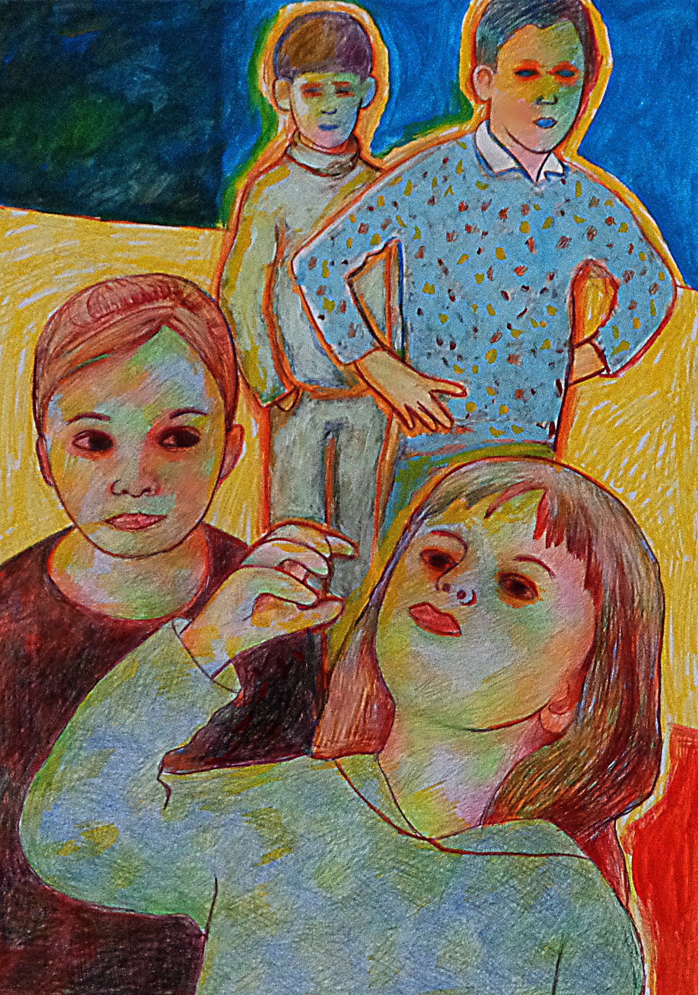 Vrij werk in aquarelpotlood en acrylverf