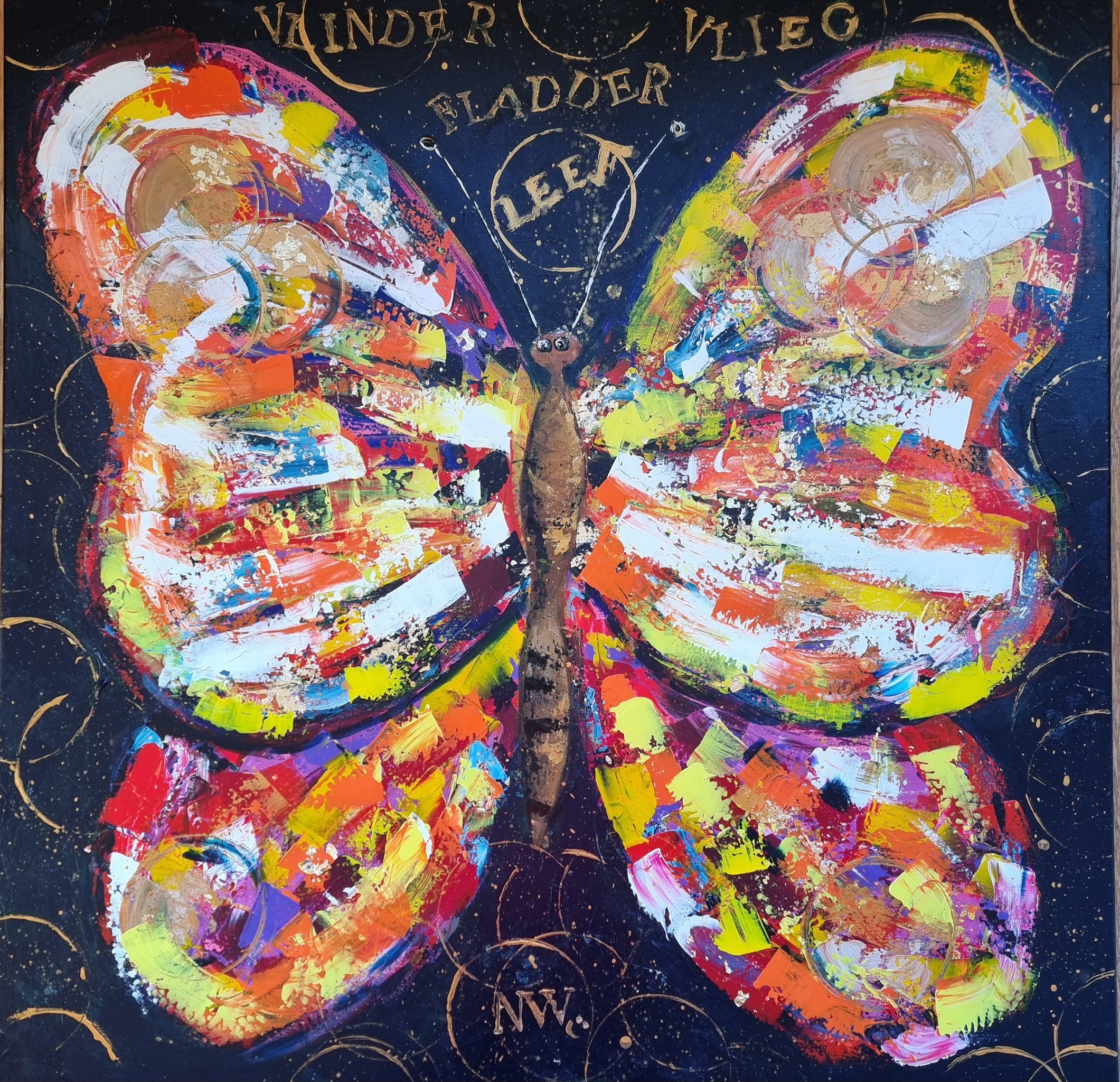 Dit is een metamorfose. Van een wit leeg doek naar deze gelaagde vlinder. Net als de vlinder zelf mag ze nu haar vleugels uitslaan. Heb het lef je vleugels uit te slaan en je wereld te ontdekken en te fladderen en te vliegen. Heb het lef om te doen en te durven met je prachtige kleuren en te stralen in het zonnelicht.