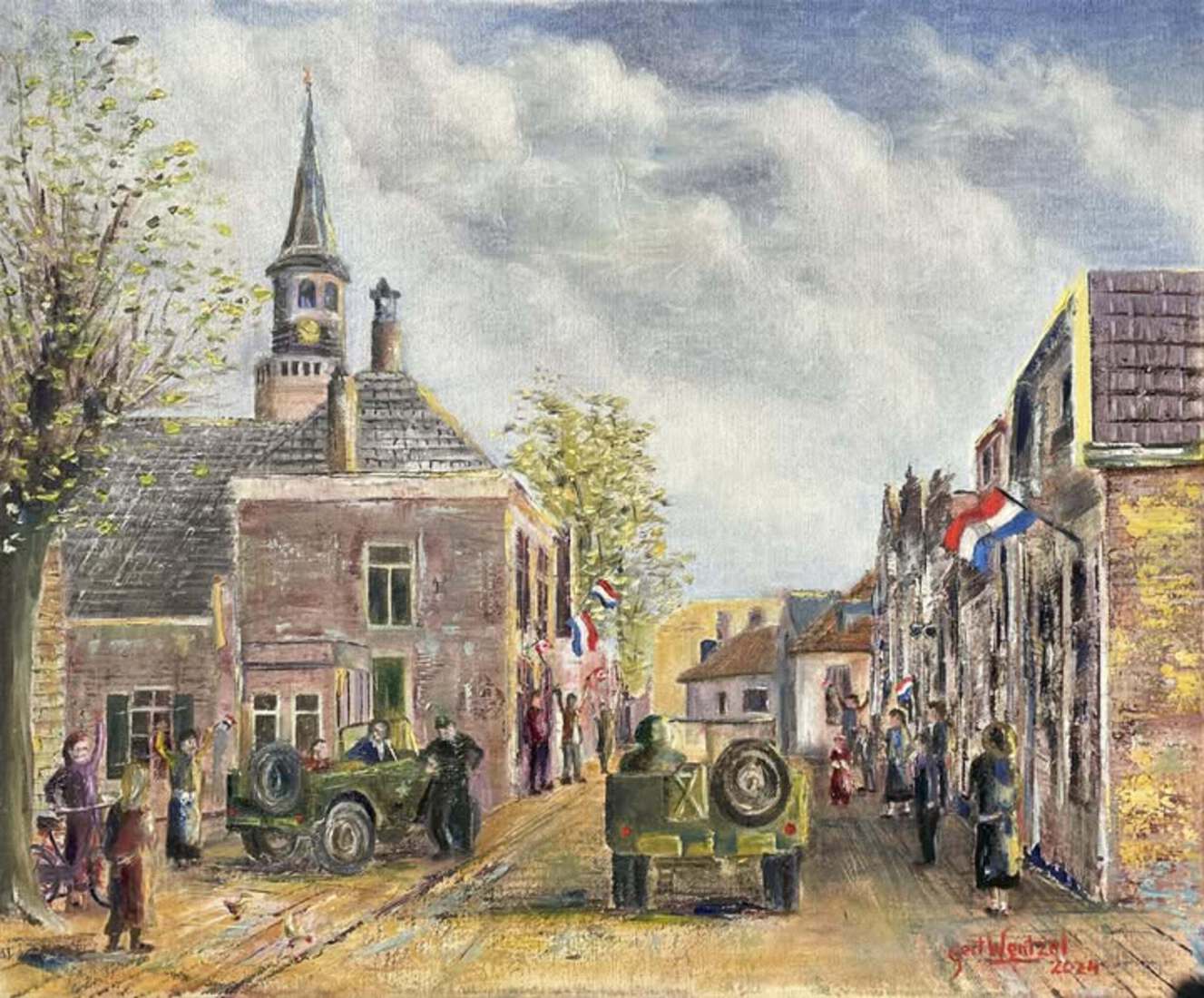 Het schilderij stelt Nunspeet voor tijdens de bevrijding door de Canadezen, op 19 april 1945.