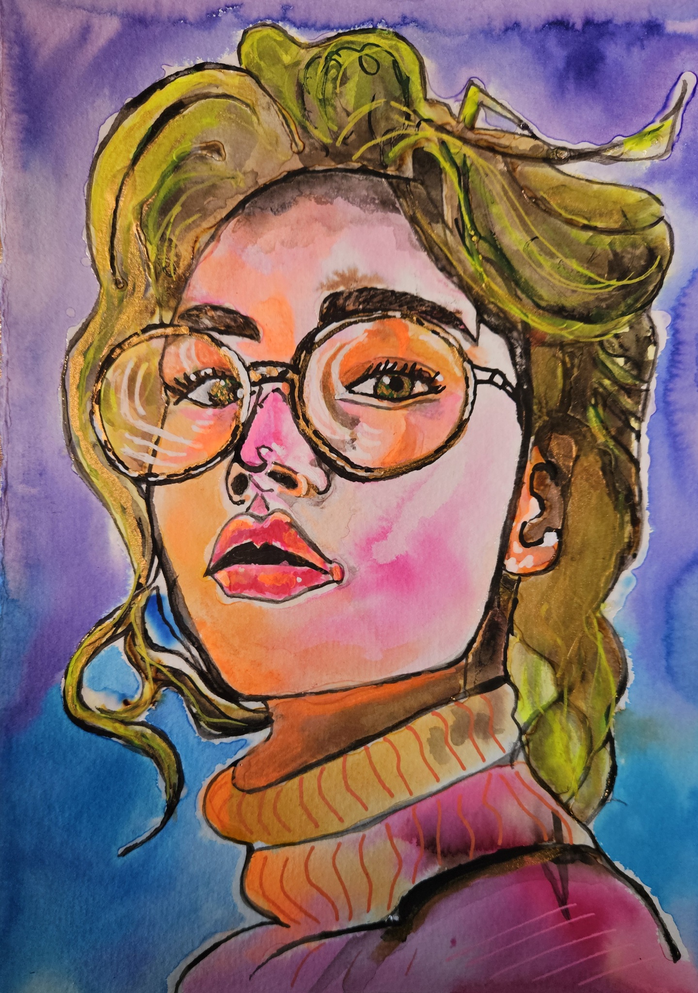 In een opdracht om strakke lijnen te schilderen is uiteindelijk dit portretje ontstaan. Met ecoline, acrylinkt en acryl stiften op aquarel papier.
