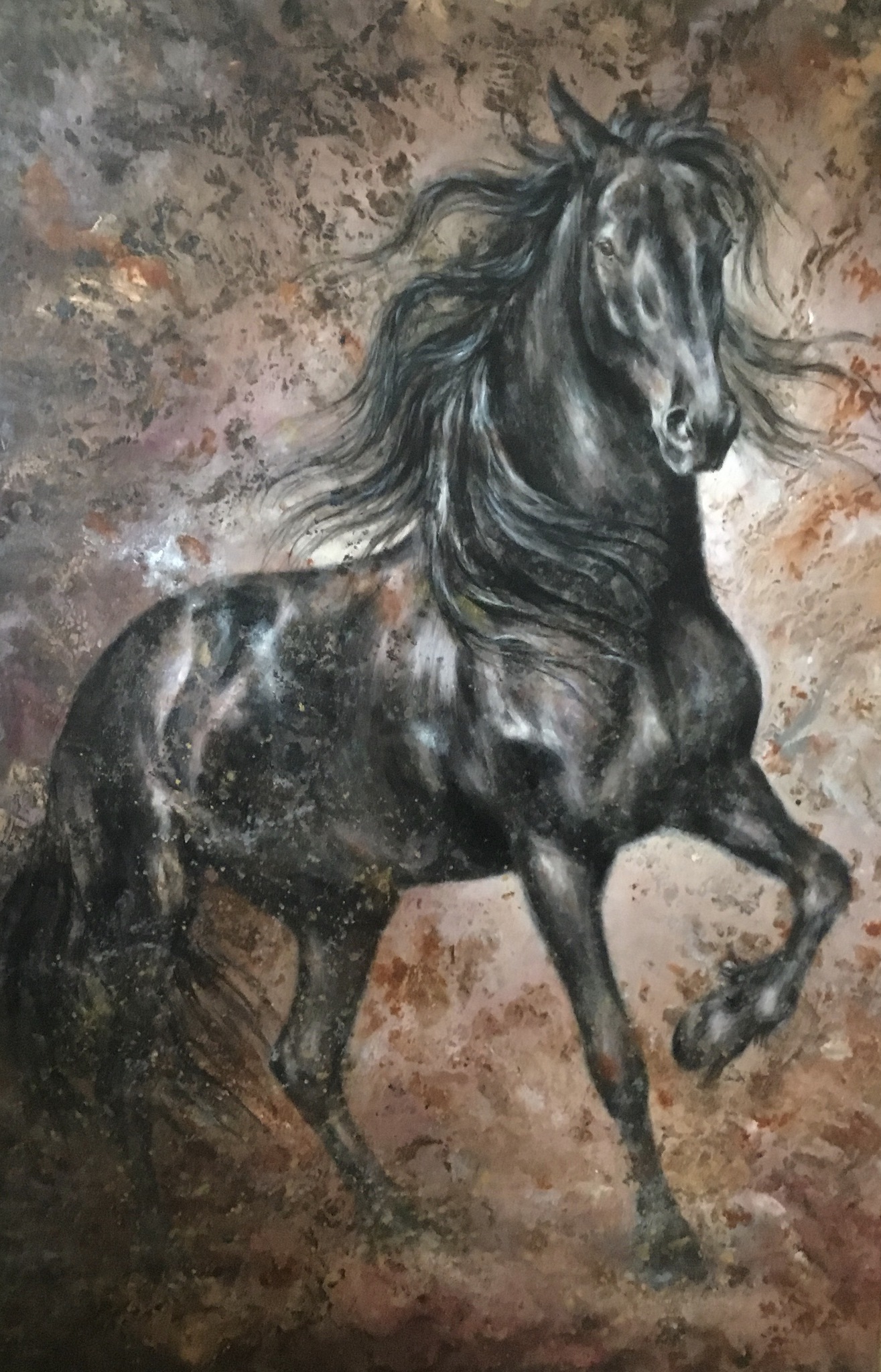 Dit schilderij is van een jong fries paard die zich mooi, speels in vrijheid toont. Het is een schilderij, geschilderd in gemengde technieken