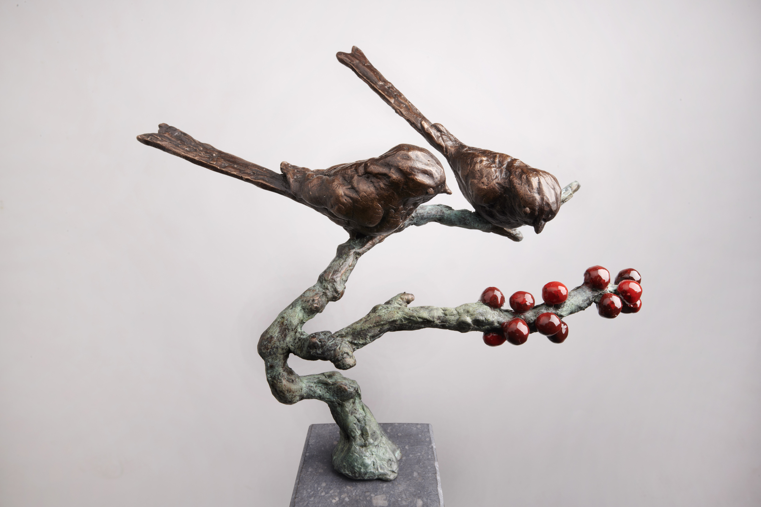 Twee staartmezen op bessentak, brons, op een zuiltje van Belgisch hardsteen. Exclusief gemaakt voor Galerie Honingen in een gesigneerde en gelimiteerde oplage van 15 exemplaren. Uitsluitend verkrijgbaar bij de galerie: www.honingen.com