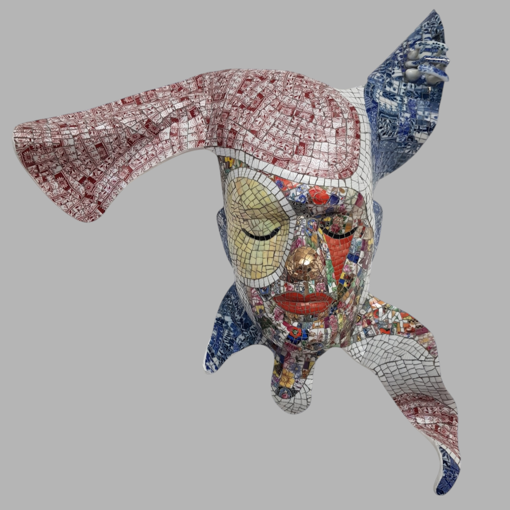 Alweer nummer 9 in de rij van wandsculpturen. Met de hand gemaakt, incl. de 3 oortjes en mijn initialen WA. Ook deze wandsculptuur is voor een deel beplakt met ROOD porselein in combinatie met divers, wit en blauw. Deze wandsculptuur is NIET te koop !