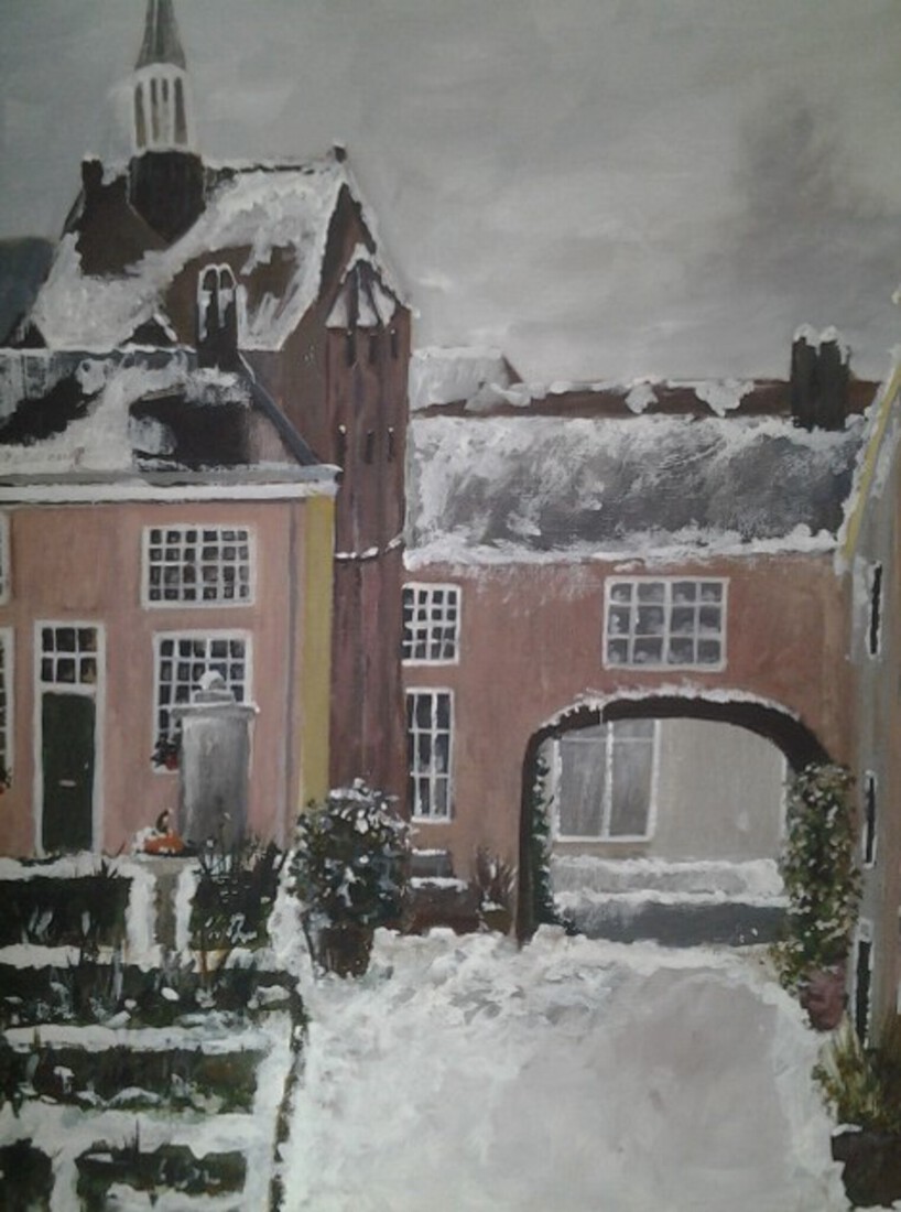 Begijnhof Breda in de winter, en plein air geschlderd in acrylverf.