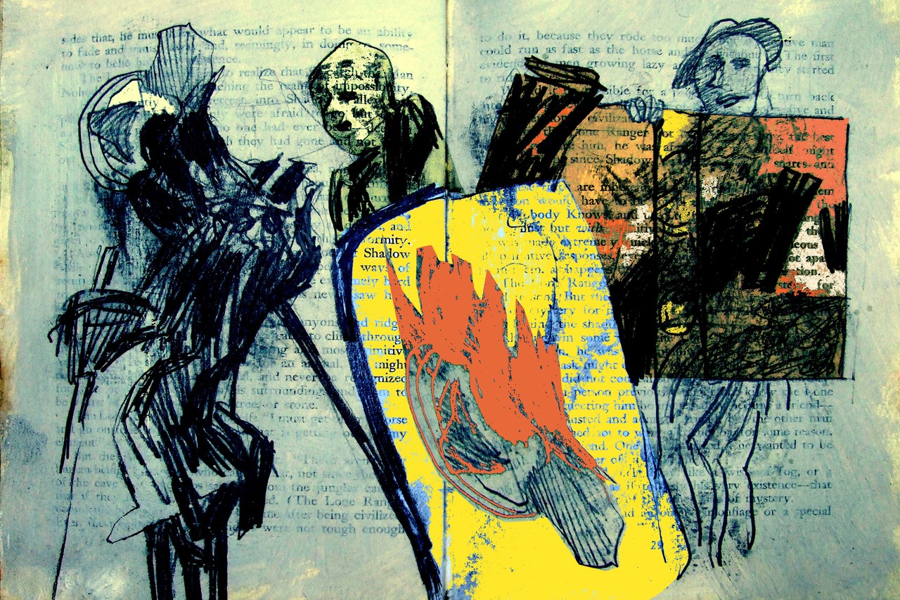 Tekening op bladspiegel van een boek, digitaal bewerkt. Afgedrukt op 310 grs fine art papier.