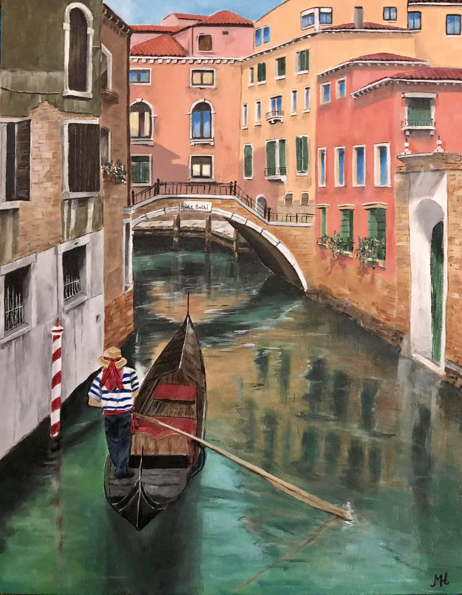 Een sfeervol schilderij van een gondelier die door de betoverende grachten van Venetie vaart. VERKOCHT