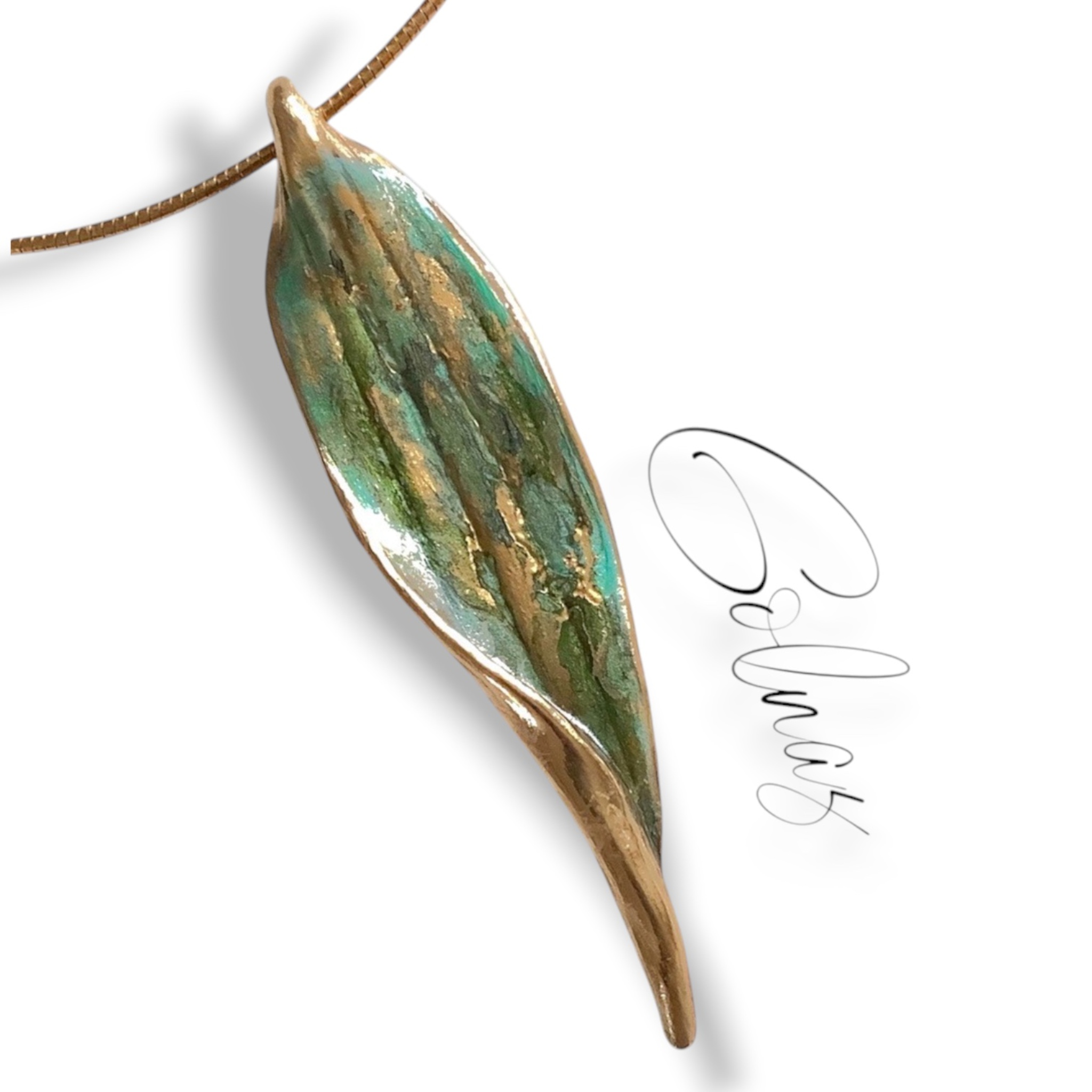Bronzen hanger, in de vorm van een blad, aan vergulde zilveren ketting