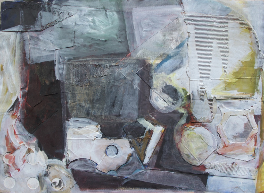 Door collage en schilderen onstaan vormen die naar objecten verwijzen.