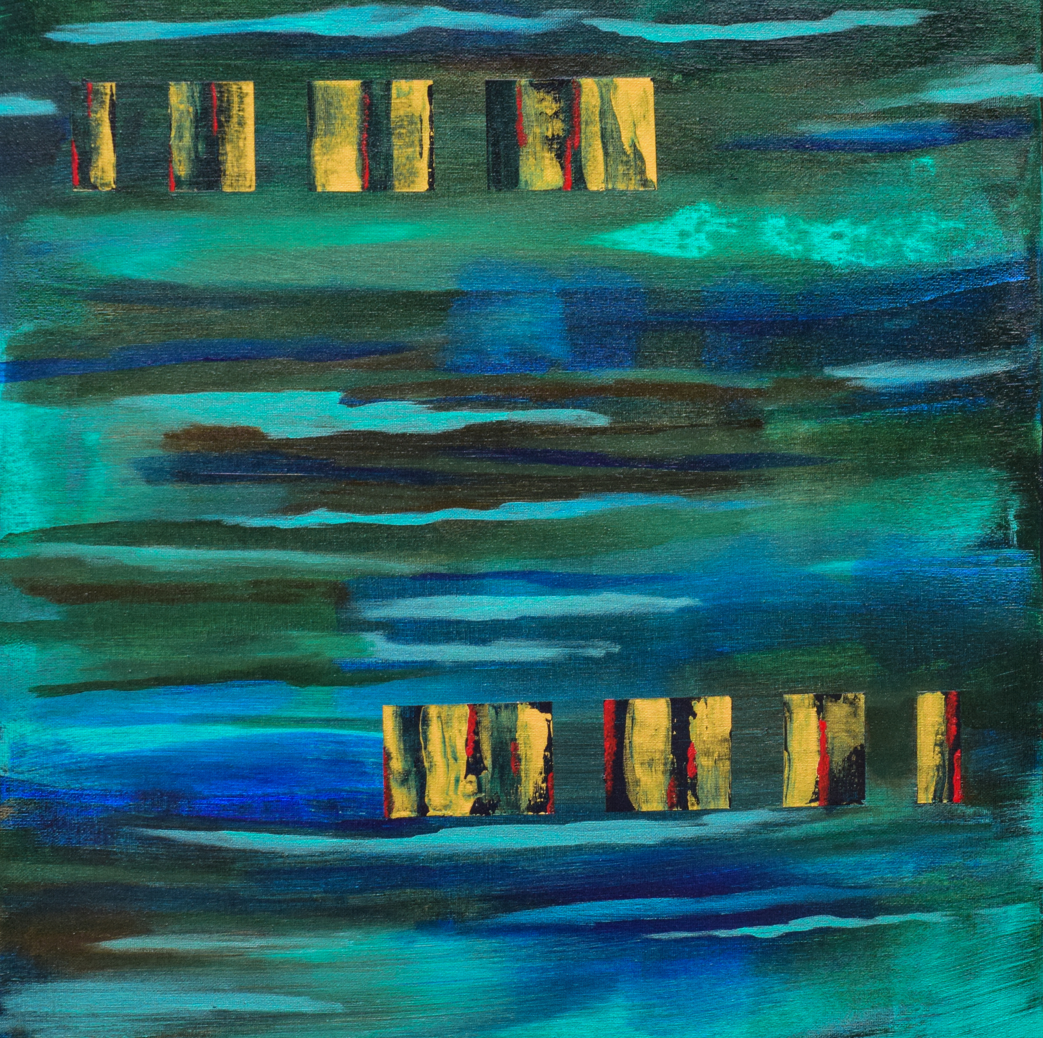 Schilderij in blauw- en groentinten, gecombineerd met goudtint.