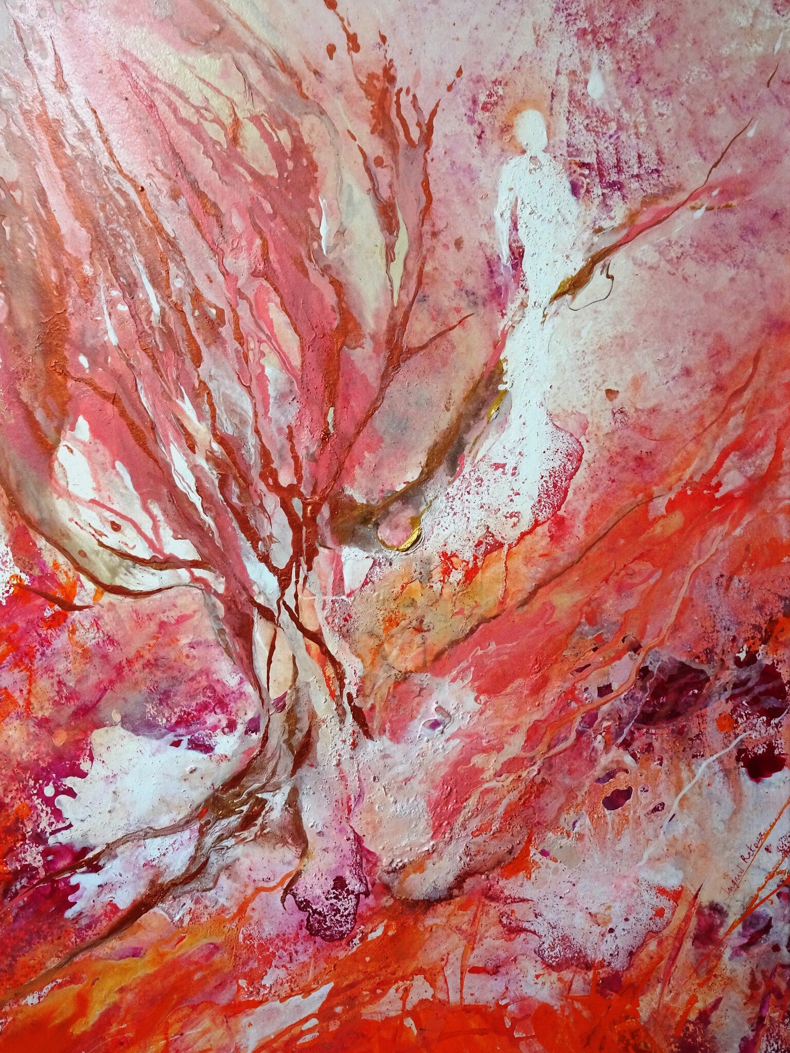 Voor mij is schilderen een vorm van spelen. Ik speel met licht, kleur en beweging, vanuit wat ik op dat moment voel. Die inwaartse stroom volg ik opdat die zich via mijn handen kan uitdrukken. Daarbij is het telkens weer een verrassing wat daaruit ontstaat. Elk werk creëert dus in zekere zin zichzelf en komt uit ergens een dimensie die verder reikt dan puur mezelf. Daarom noem ik mijn schilderijen ook geleiders van het meer dan woorden kunnen zeggen en ogen kunnen zien…