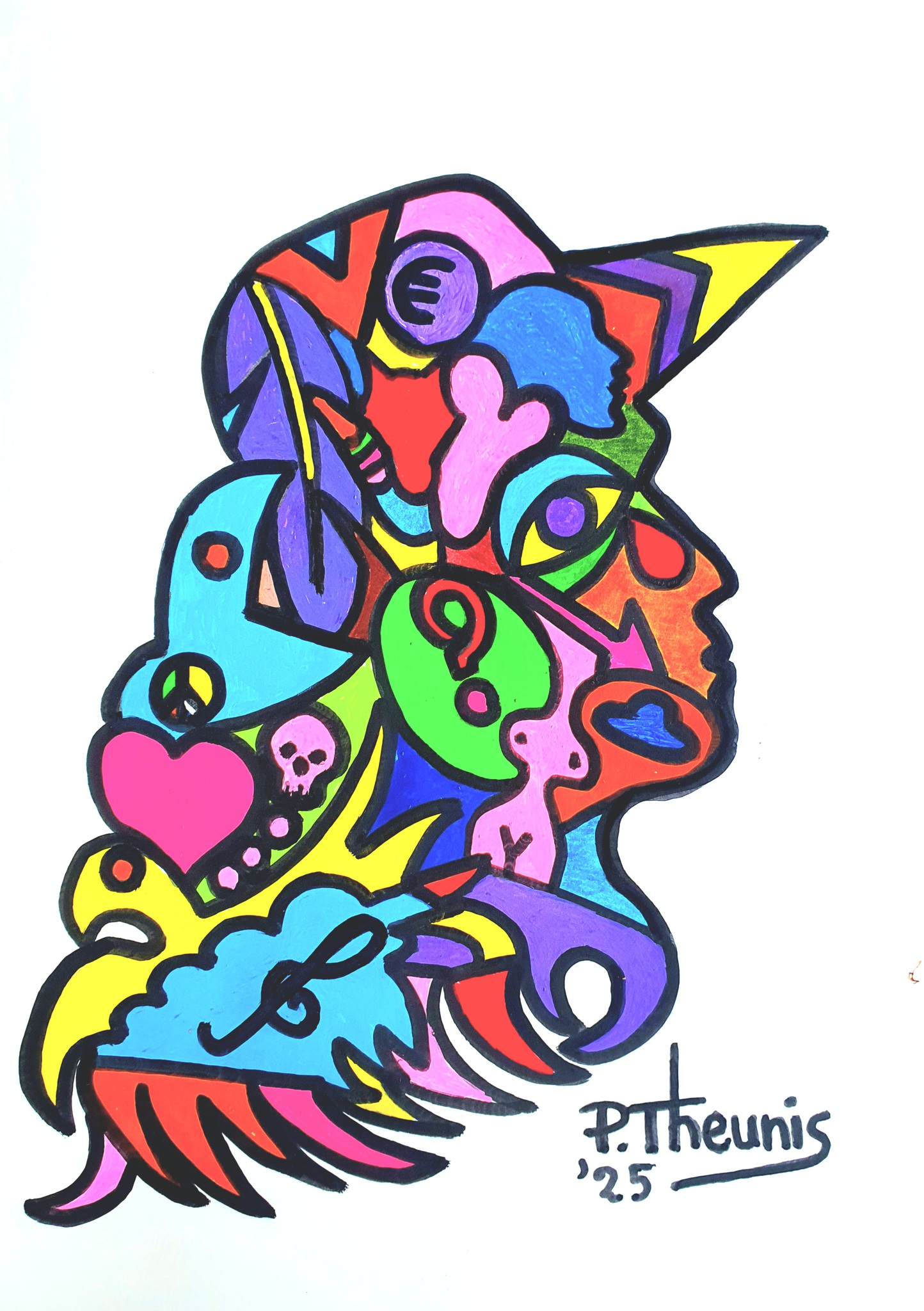 Een voorstelling van de gedachten die zich regelmatig in mijn hoofd afspelen. Tekening op papier met acrylmarkers