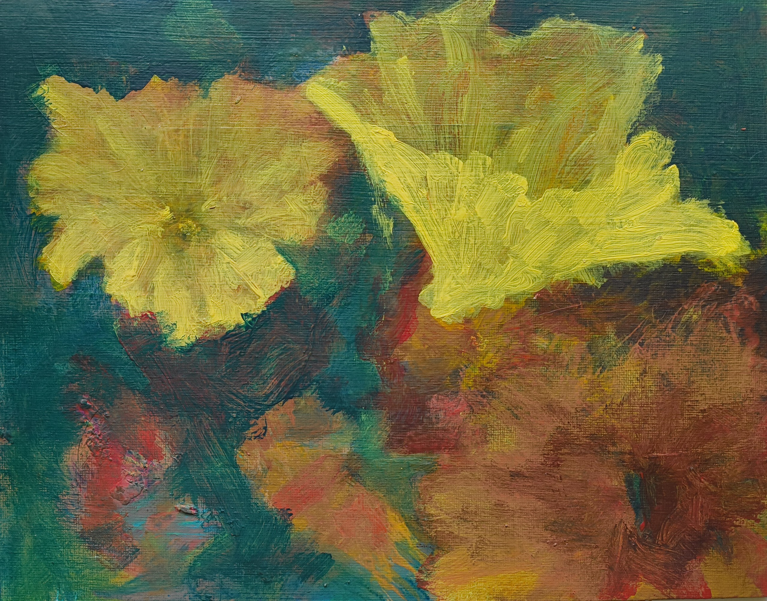 De contrasten tussen licht en donker geven het schilderij een dynamische spanning. De achtergrond, met zijn losjes gemengde en deels transparante kleuren, voegt diepte toe en versterkt het organische karakter van het werk. Er is een subtiele interactie tussen figuratie en abstractie.