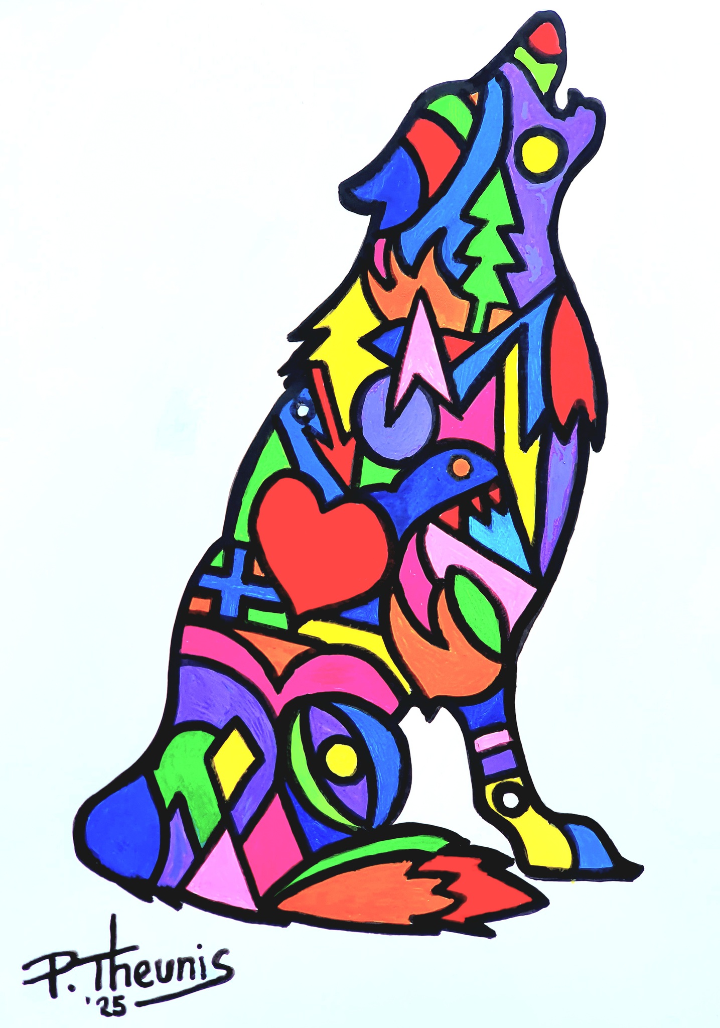 Wolf in profiel getekend met acrylmarkers op papier