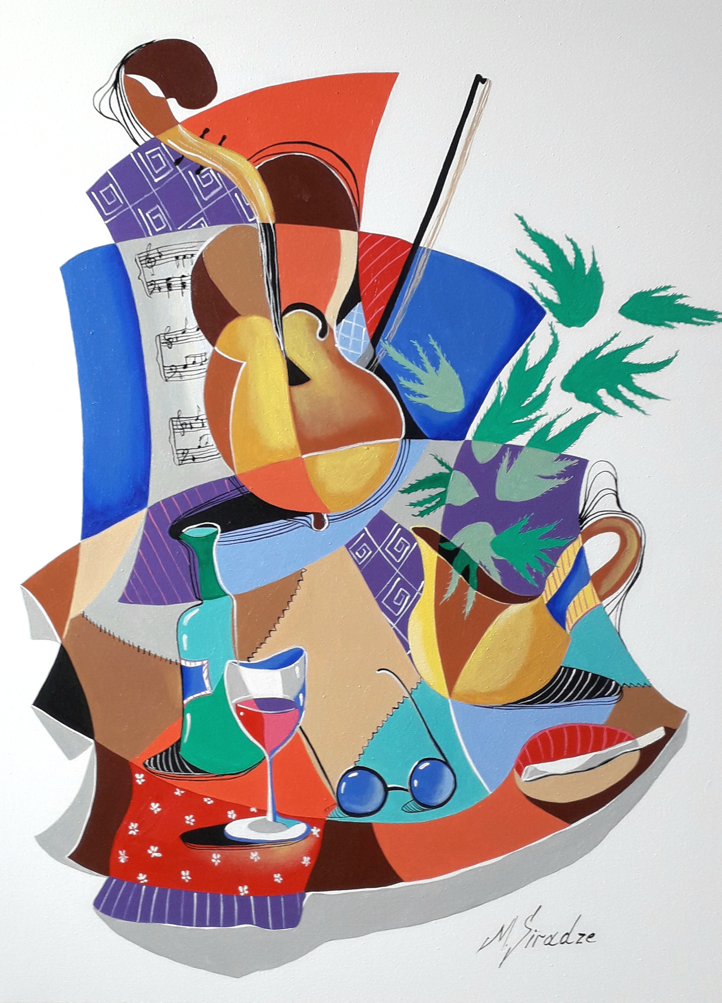Olieverfschilderij stilleven met viool. Stijl : cubisme, gekleurde grafiek. Afmetingen: 80 × 60 cm. De zijkanten van het doek zijn meegeschilderd, geen lijst nodig. Het schilderij is beschermd met laag vernis.