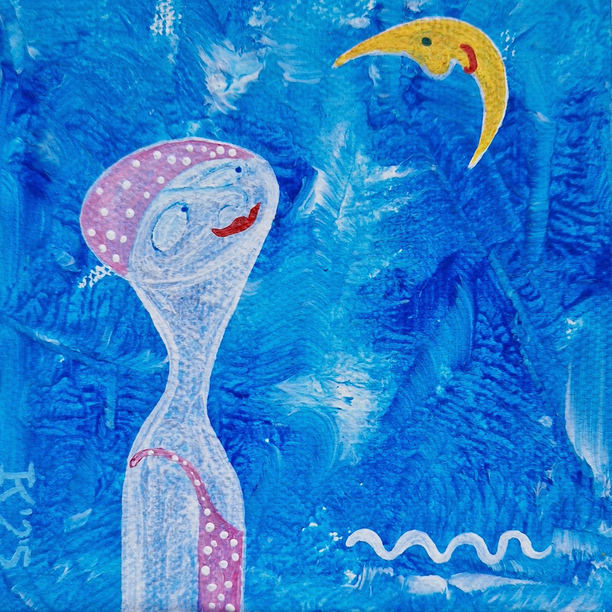 Acrylverf op katoen, 10 bij 10 cm, Pictoright. Werkje kan opgehangen worden. Voor aanschaf even beeldbellen is handig, want in werkelijkheid is de kleur blauw net even anders. De prijs is exclusief verzendkosten.