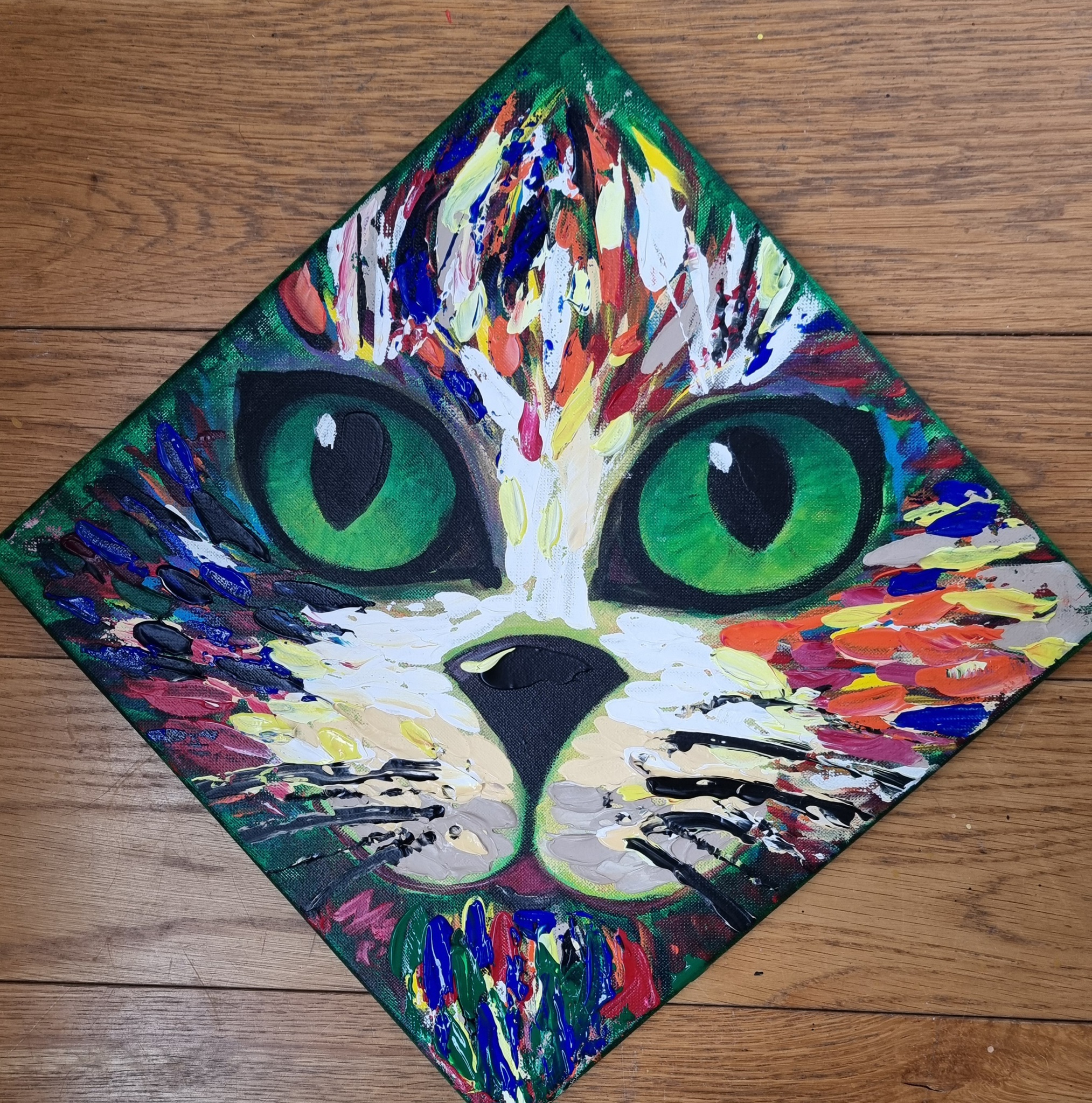 Heerlijk met groen gestart en toen ontstond the Grinch. Maar gelukkig met wat meer verf en pasta werd het toch een mooie kattenkop.