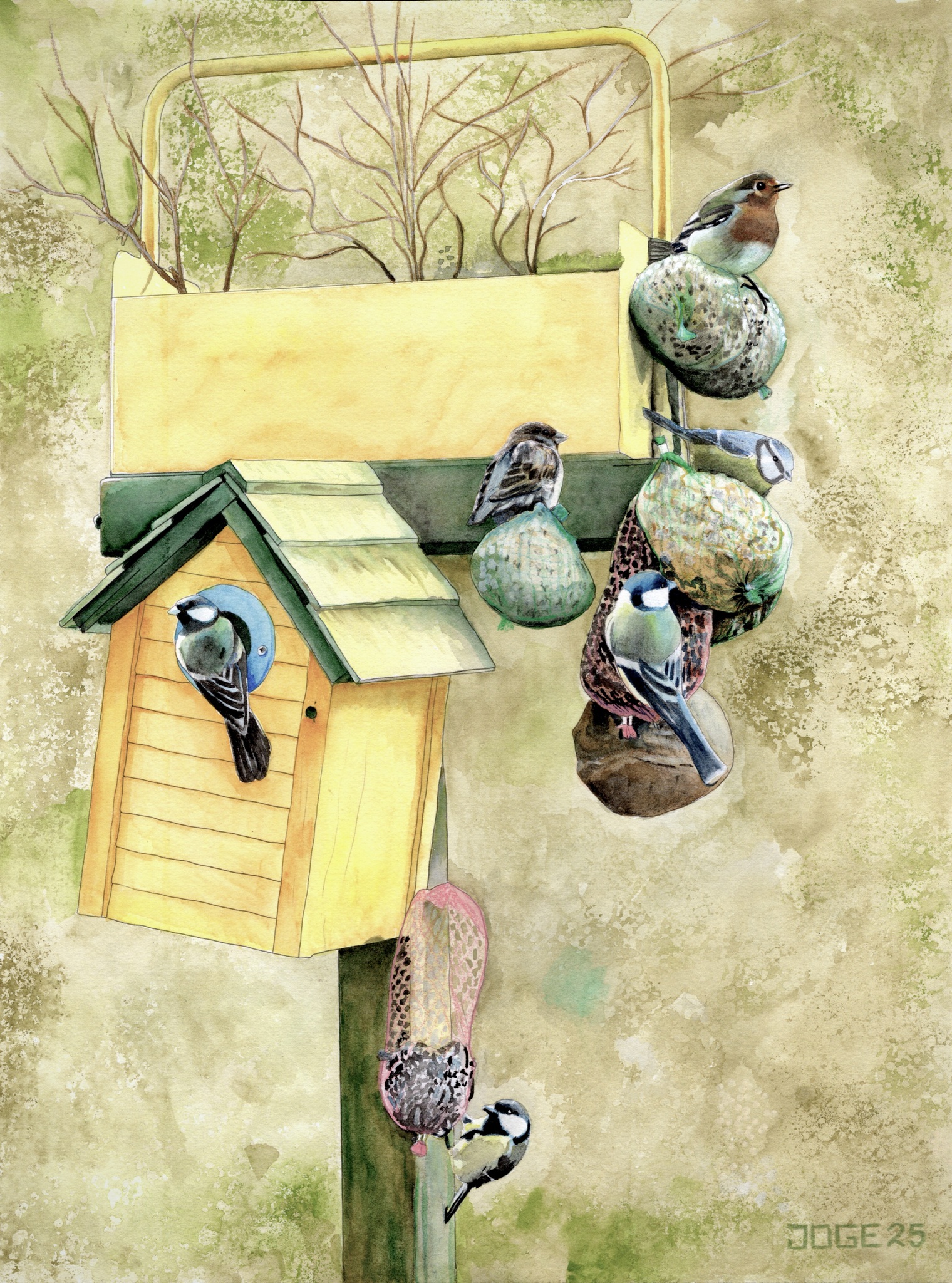 Aquarel Pimpelmees Vogelhuisje Vogels Koolmees Roodborstje Mus