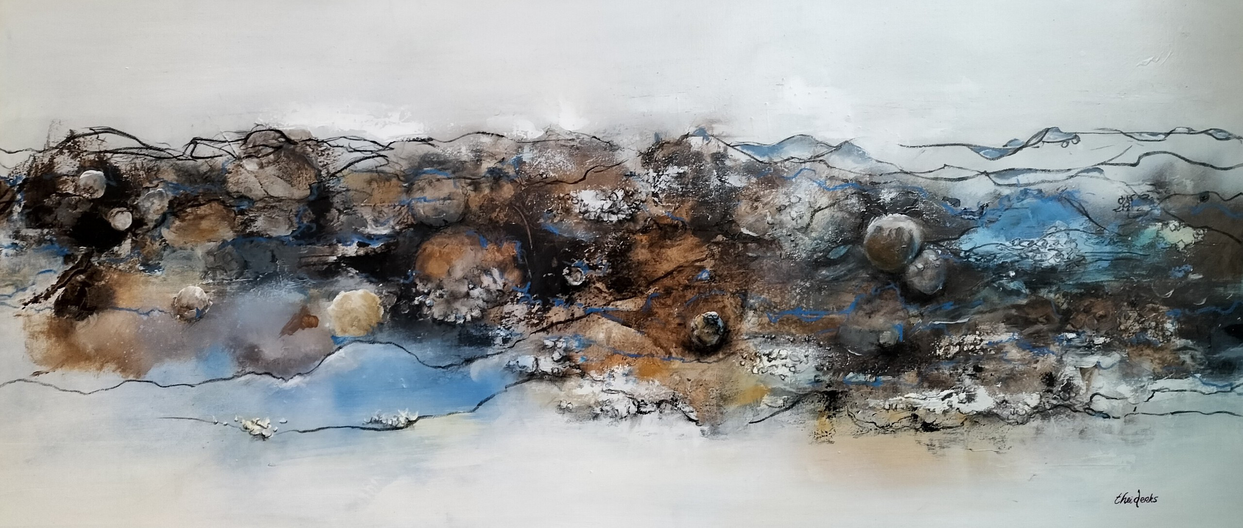 Mixed Media op canvas 80 x 180 x 2 cm. Exclusief stalen lijst.
