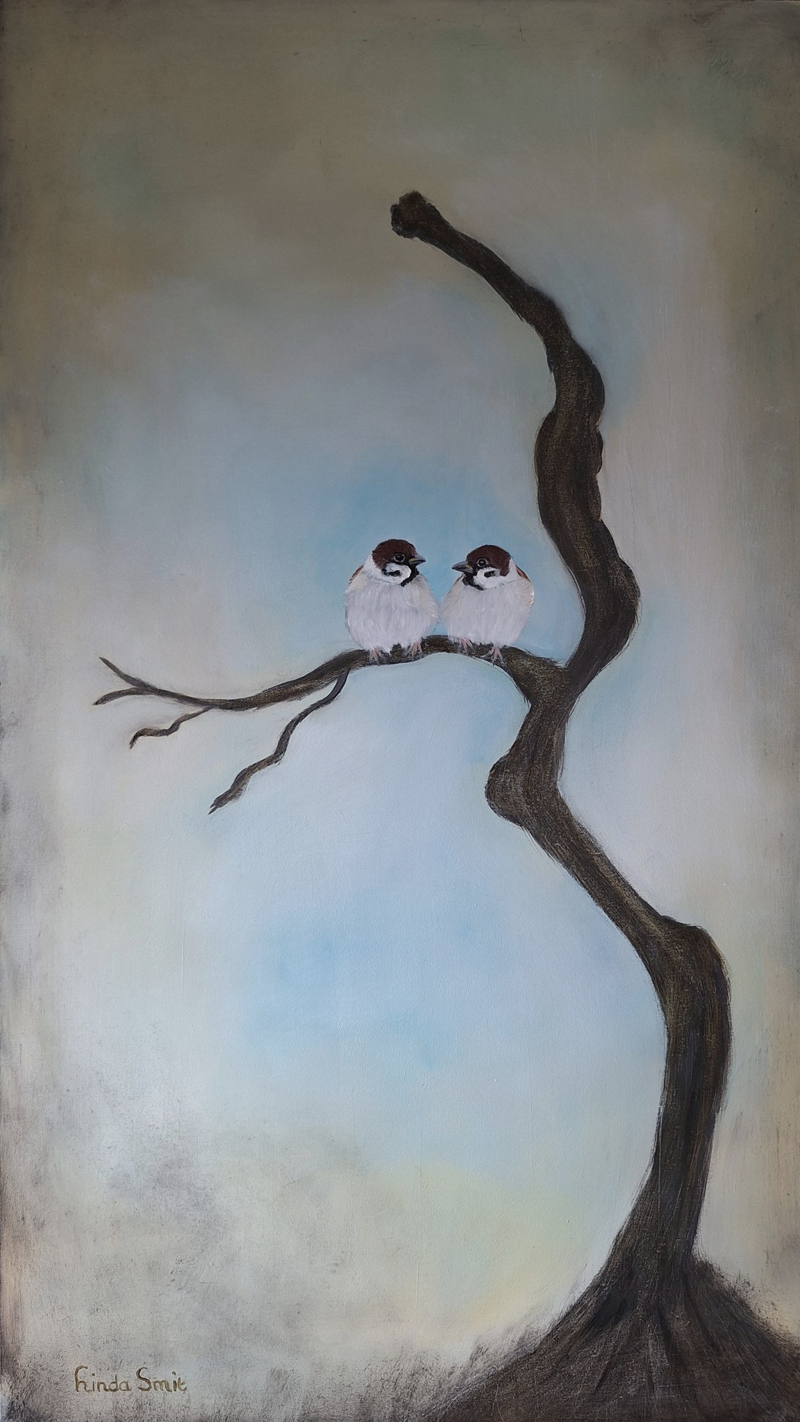 Musjes in boom gemaakt voor een wabi sabi project, olieverf op mdf 40x70 met zwarte baklijst.