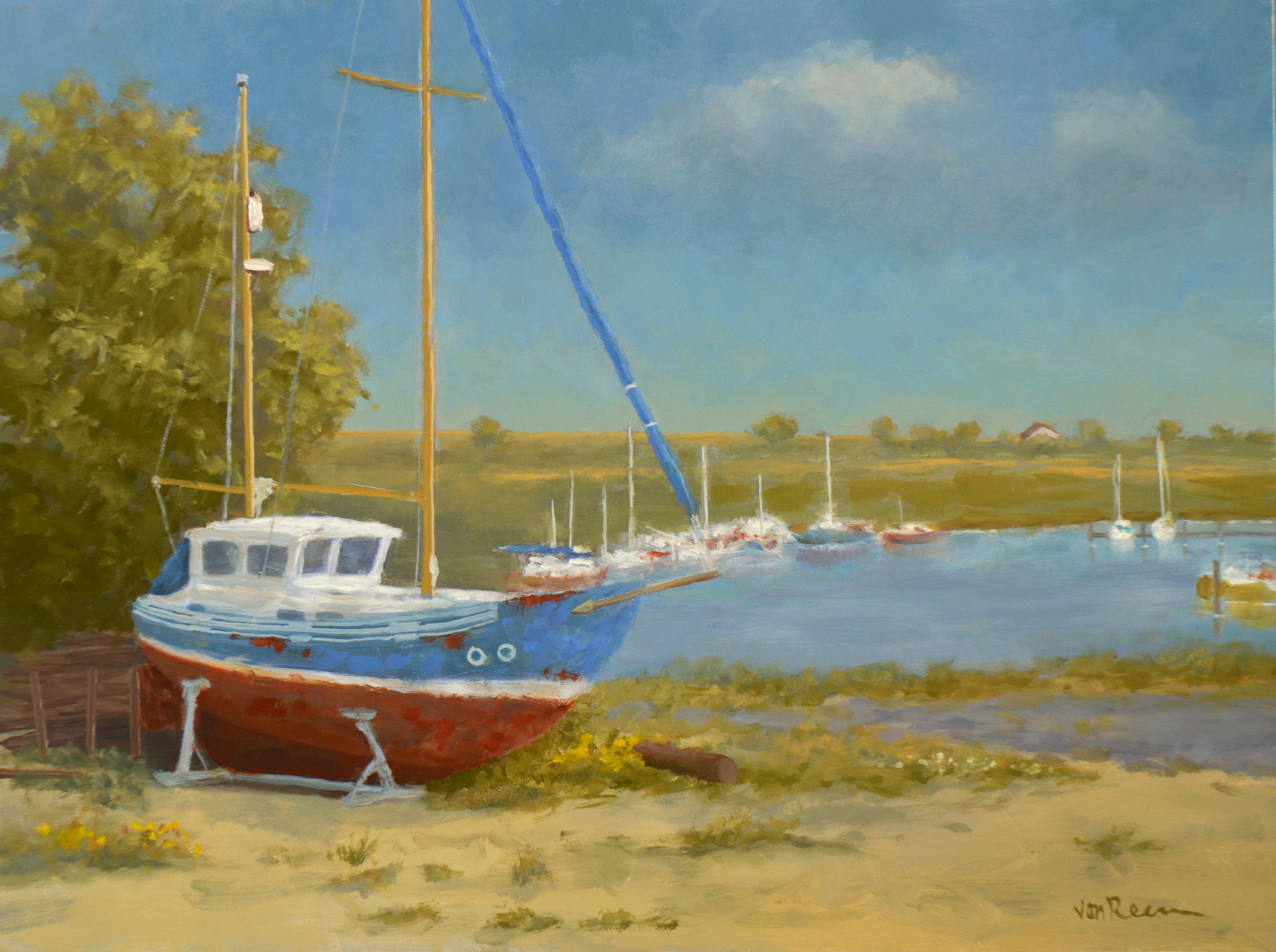 Roeland van Reem schildert met olieverf op linnen of op paneel . Belangrijke thema's zijn; bloemstilleven, strand, zee, sneeuw- en polderlandschap.