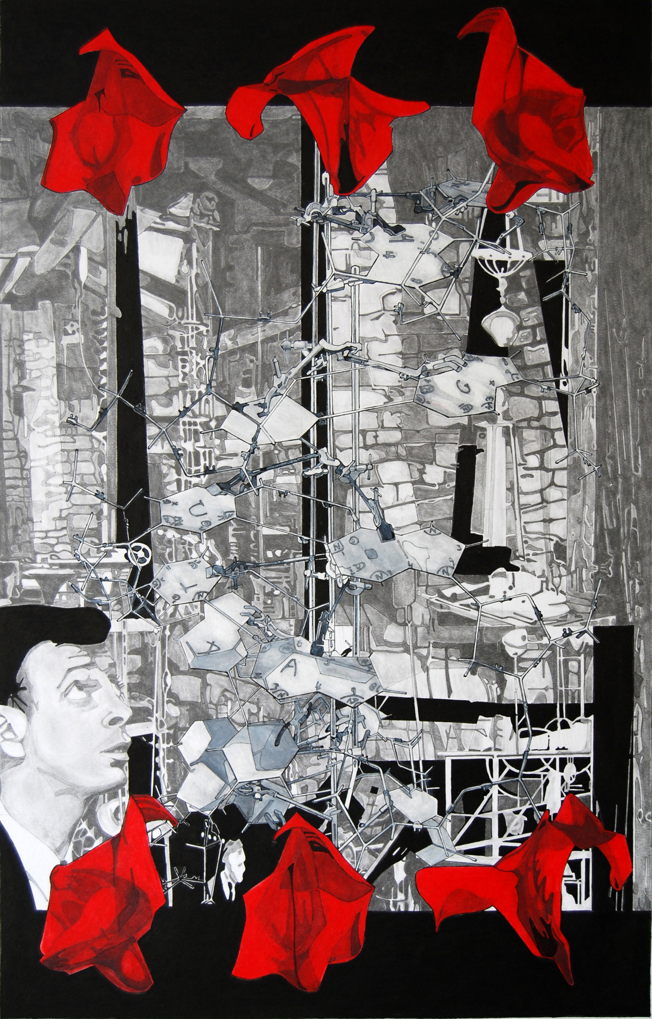 In 1605 schreef Sir Francis Bacon, de vader van de experimentele wetenschap, het boek The Advancement of Learning. Het ging niet alleen om wetenschap, maar om het geloof dat wanneer je de werkelijkheid begrijpt, je deze kunt veranderen en verbeteren, uitmondend in de utopische toekomst die Bacon beschreef in het werk The modern Atlantis. Mary Shelley stond in 1831 ambivalent tegenover de utopische belofte van de wetenschap wanneer ze Victor Frankenstein in een laboratorium de ultieme droom laat realiseren, het creëren van leven. Uiteindelijk zal Victor Frankenstein zijn creatie, die aan zijn controle is ontsnapt, najagen tot de noordpool. De roman Frankenstein or the modern Prometheus is in 1931 verfilmd. In het laboratorium van Victor Frankenstein uit de film bevindt zich nu James Watson, die samen met Francis Crick in 1953 een drie-dimensionaal model ontwikkelde die het DNA-molekuul, wat gezien kan worden als de blauwdruk van het leven. Hierin komen Francis Bacon en Victor Frankenstein samen in de figuur van James Watson, wiens theorieën over de relatie tussen ras en intelligentie waarschijnlijk niet zouden leiden tot een betere wereld, laat staan tot een Utopie, maar tot vraagstukken van genetische manipulatie de verder gaan dan de genetisch gemanipuleerde bloemen. Het beeld is geen verwerping van wetenschap, maar stelt vragen bij de vermeende neutraliteit daarvan. De menselijke zwakheid is ook terug te zien in het negeren van Rosalind Franklin bij het toekennen van de Nobelprijs.