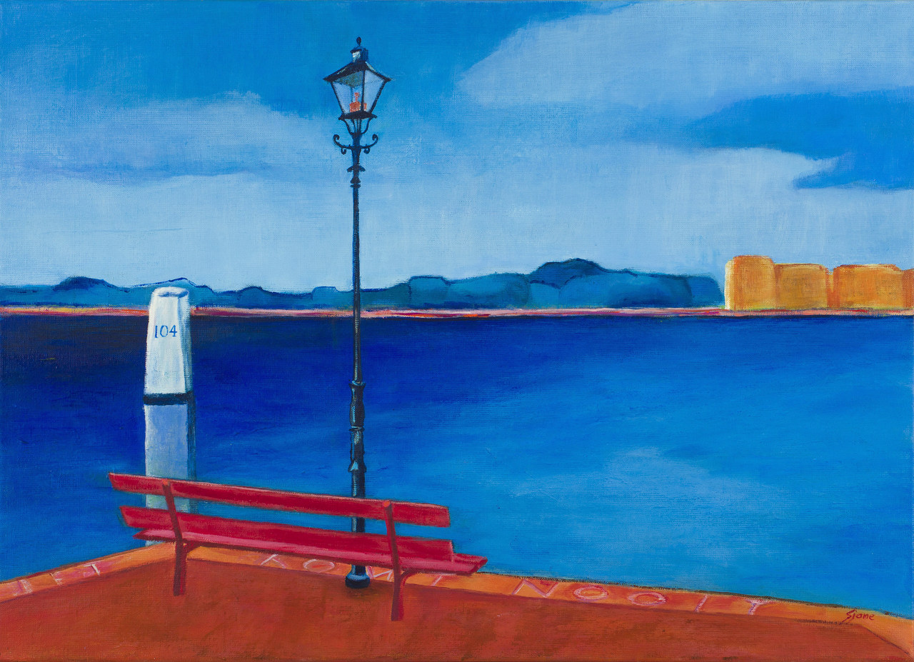 Als je op dit bankje zit heb je een prachtig uitzicht op het Groothoofd van Dordrecht en drie rivieren: de Oude Maas, de Noord en de Nieuwe Merwede. Eén van de mooiste plekjes van Dordrecht. Op de rand langs het water is een deel van de tekst, geschreven door Jan Eijkelboom, te zien : "wat blijft komt nooit terug" Afm. 50 x 70 cm.Ht schilderij is ingelijst in een blank houten baklijst