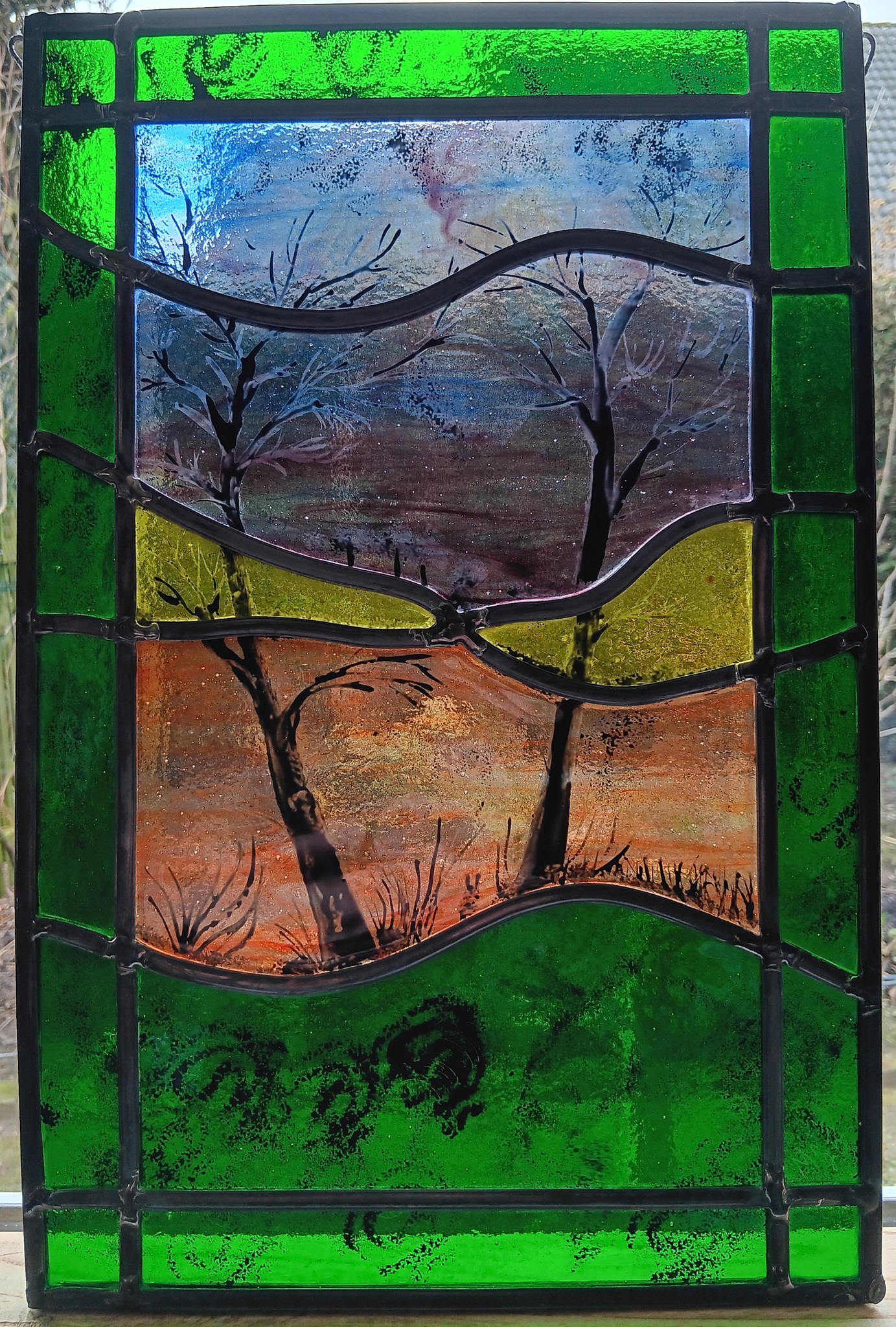 Fields of Gold - beschilderd glas (ovengebakken) en gezet in een loden frame - in feite gebrandschilderd glas zoals je dat in kerken en kathedralen ziet. Voor de afbeelding zijn verschillende glaskleuren gebruikt.