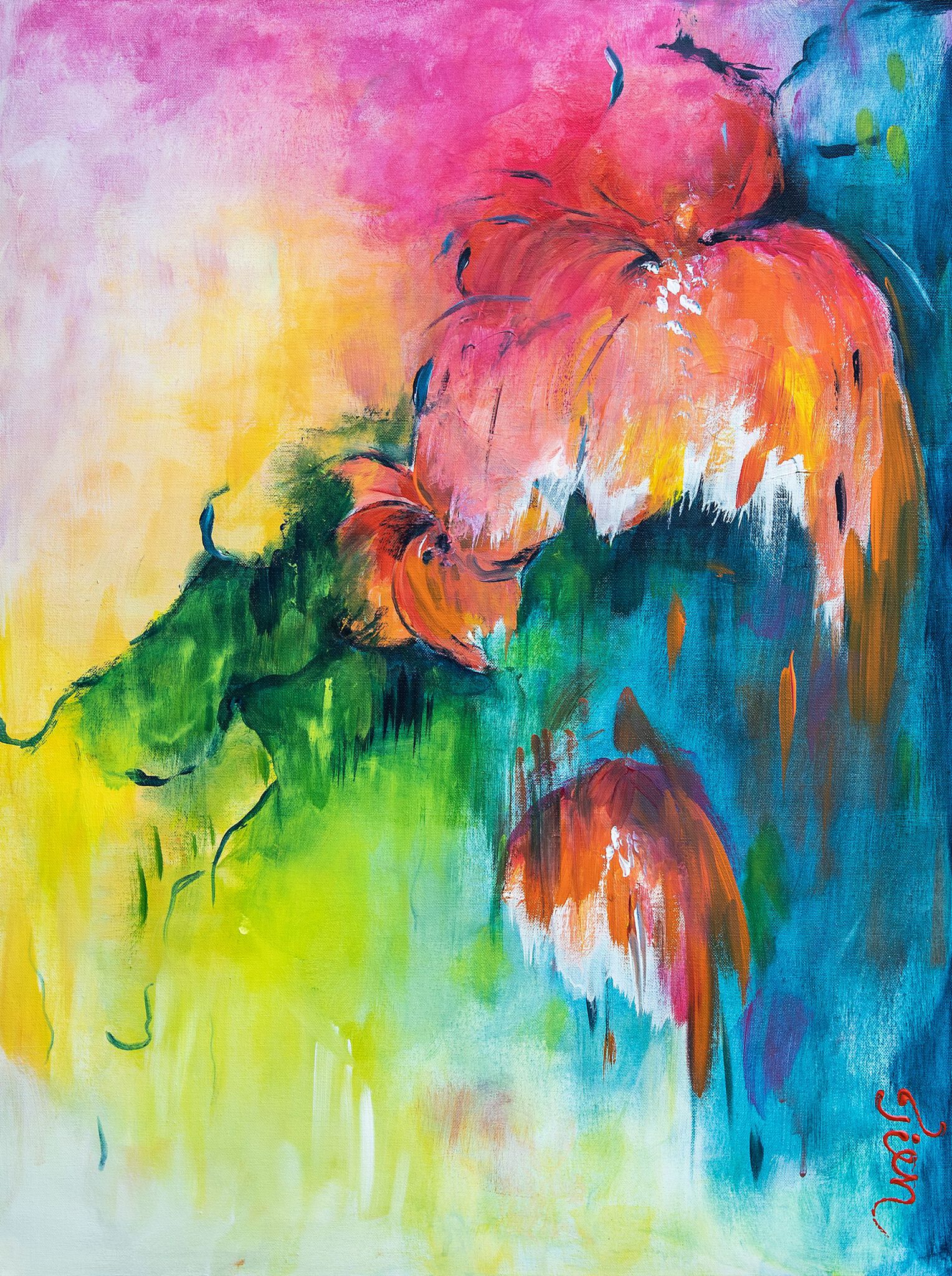 Floriade , Een kleurig abstract werk Eens een bloem , maar nu verwelkt!!!! Geabstraheerd met veel spons werk als techniek.
