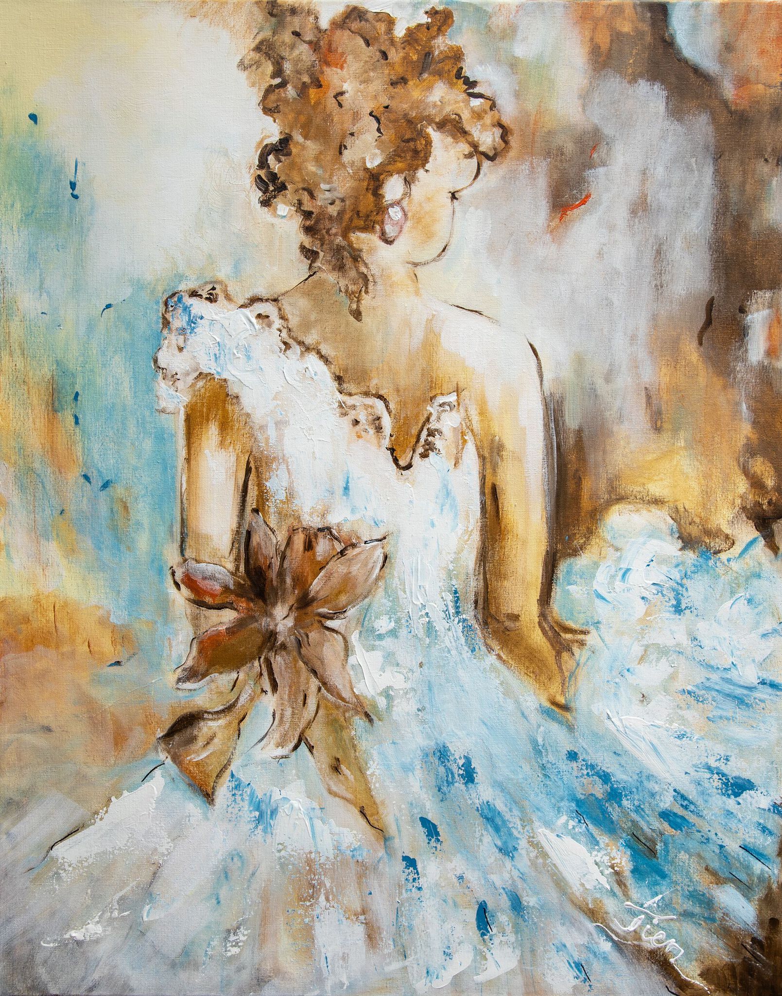 Gala, Een rustig werk in bruidstinten . vooral aardtinten met een toefje blauw.Groot formaat met naturel lijst Afm. 80 breed en 100 hoog