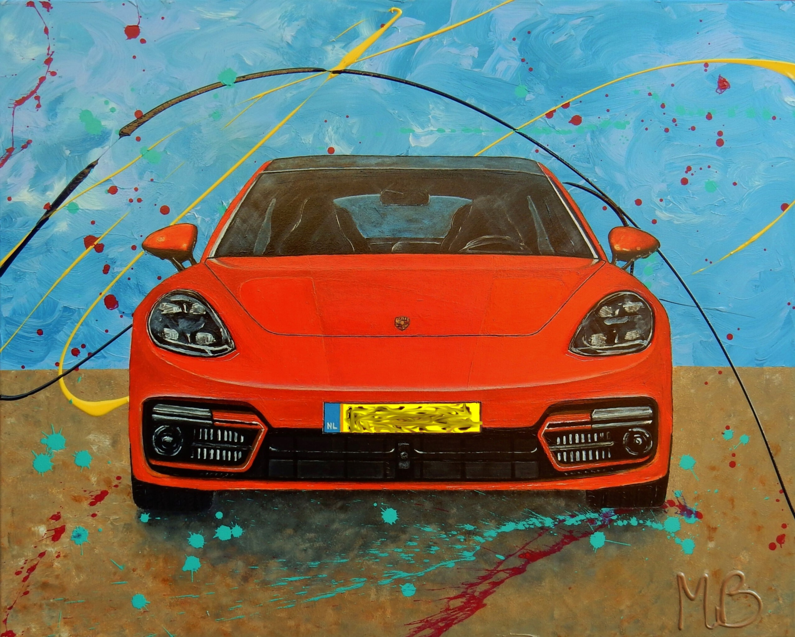 Het kunstwerk is als verrassing door de opdrachtgevers cadeau gegeven aan de eigenaar van deze bijzondere Porsche Panamera Hybride. Terwijl ik aan het schilderen ben, zie ik steeds meer details en lijnwerk waar je U tegen zegt. Alleen de kleur al. Omdat de eigenaar erg van het strand houdt, wilde de opdrachtgever dat de Porsche in een dergelijke setting op het doek kwam. Zeker omdat er zoveel details in zitten, wilde ik het ook zo realistisch mogelijk op het doek krijgen. Er gaan veel uren voorbij voordat het klaar is en de opdrachtgevers waren gelukkig erg tevreden.